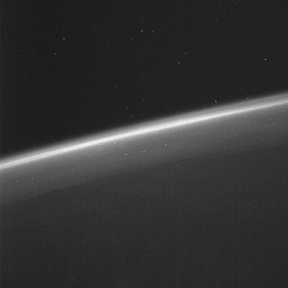 A portion of the Earth during night time, covered by layers of the atmosphere, as seen through LISA Pathfinder's star trackers on 3 December 2015. Beyond the horizon of our planet, several stars are visible, above as well as through the atmosphere.