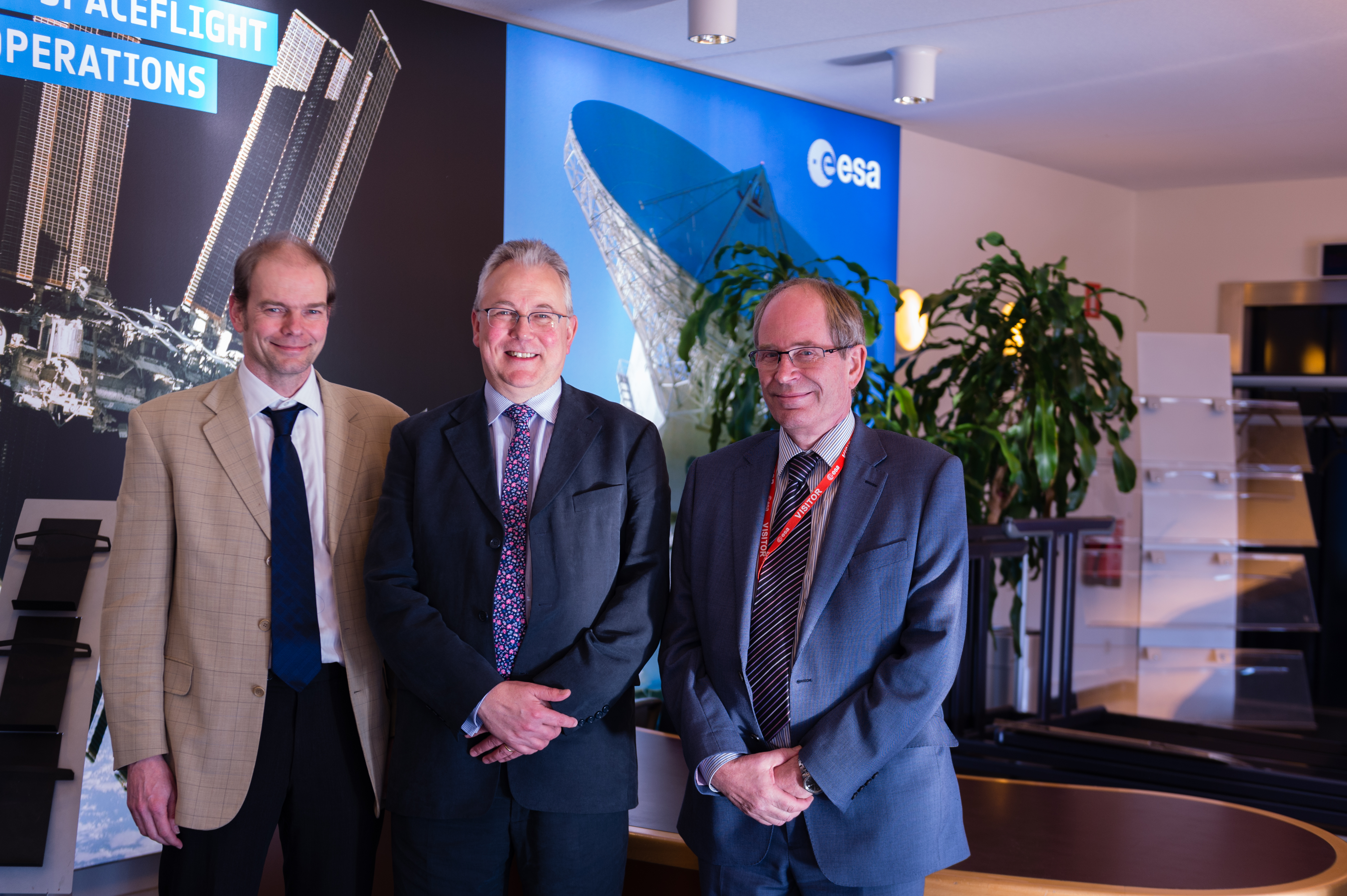 Christian Trenkel, Airbus Defence & Space Ltd system engineer (left), Dave Wealthy, Airbus Defence & Space Ltd senior system engineer and commissioning lead (centre), and Ian Honstvet, Airbus Defence & Space Ltd Project Manager (right), after the formal review of the LISA Pathfinder commissioning, held in ESTEC on 7 March 2015.