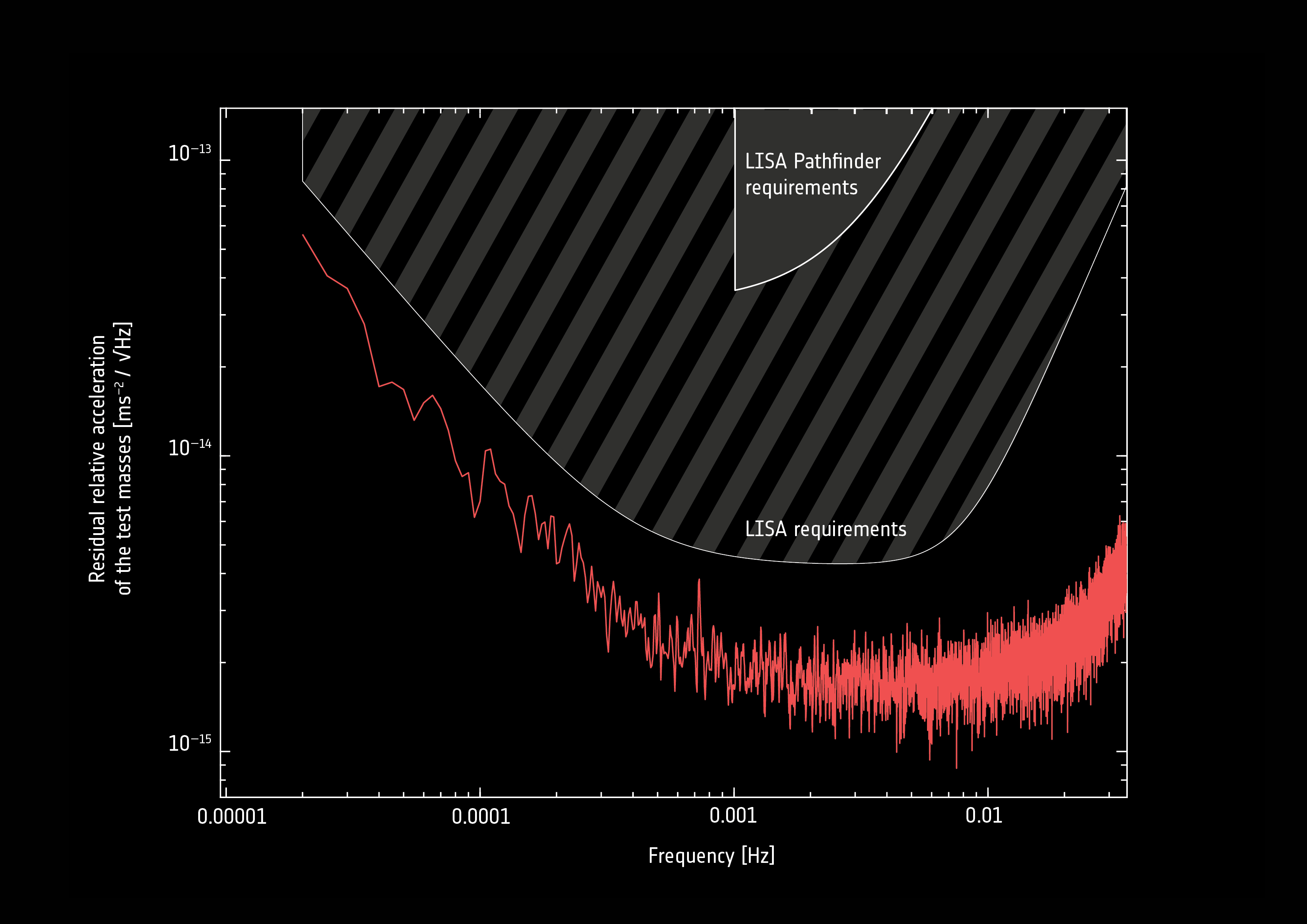 Analysis of the LISA Pathfinder mission results (red line, bottom) compared with the initial requirements (top, wedge-shaped area) and that of the future gravitational wave detection mission LISA (middle, striped area), show that it far exceeded expectations.