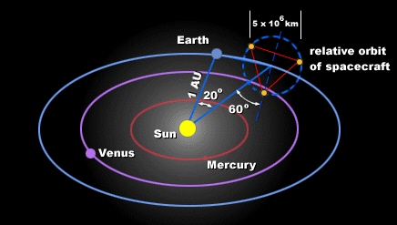A schematic diagram of the LISA spacecraft in formation as they orbit around the Sun. The spacecraft are separated from each other by 5 million kilometres and trail behind the Earth at a distance of 50 million kilometres (equivalent to 20 degrees).