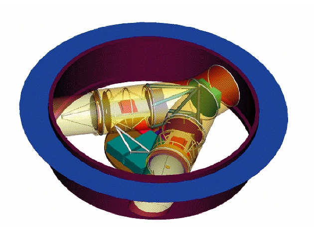 Cutaway view of one of the three identical LISA spacecraft. The main structure is a ring with a diameter of 1.8 m and a height of 0.48 m. The top of the spacecraft is covered by a solar cell array, removed here to allow a view of the Y-shaped payload.