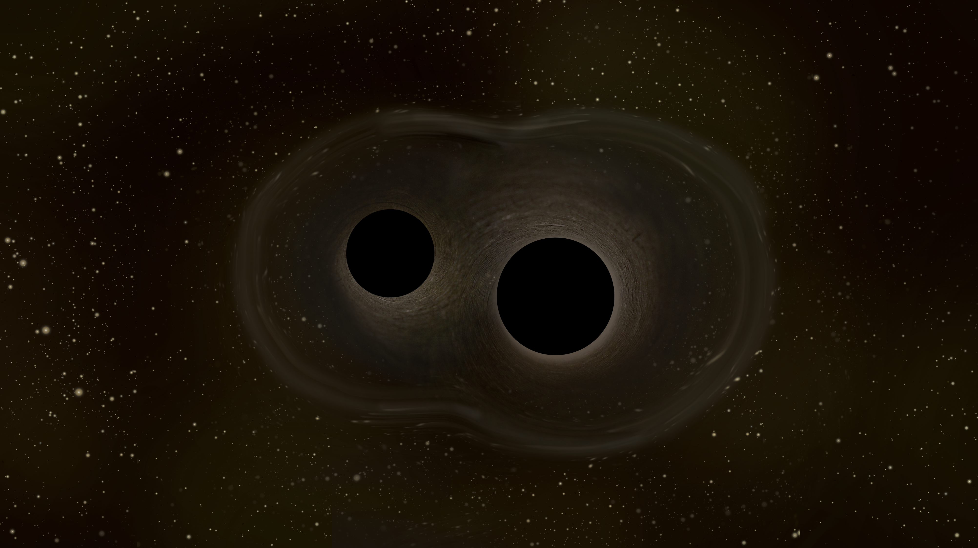 Artist's impression of two black holes that are spiralling towards each other and will eventually coalesce. Black hole mergers are extremely energetic events that release gravitational waves – fluctuations in the fabric of spacetime.