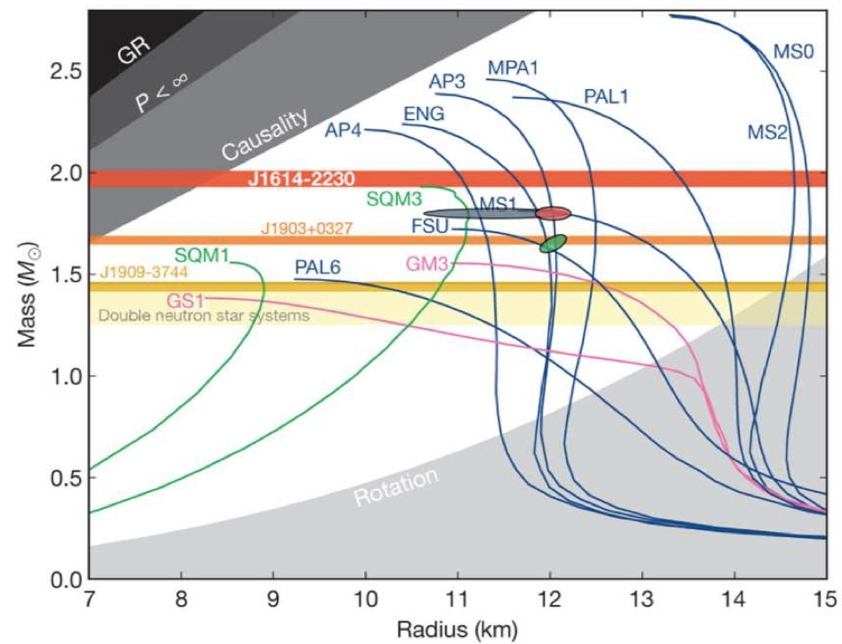 Mass-radius curves of representative equations of state (EOS) for nucleonic (blue), nucleonic plus exotic (pink), and strange quark (green) matter. Horizontal bars represent mass determinations of binary radio pulsars. Regions to the upper left are disallowed by General Relativity and causality. The lower right region is excluded by the highest-frequency pulsar known (716 Hz).