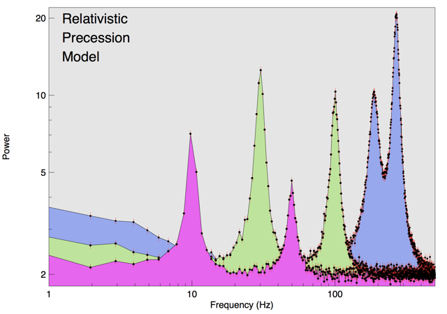 This figure shows the outcome of some simulations of LOFT measurements for black hole high-frequency QPOs. This particular simulation is a prediction of the evolution for the relativistic precession model.