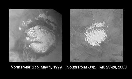 Image showing the Martian North Polar Cap on 1 May 1999 (left) and the Martian South Polar Cap on 25-26 February 2000 (right)