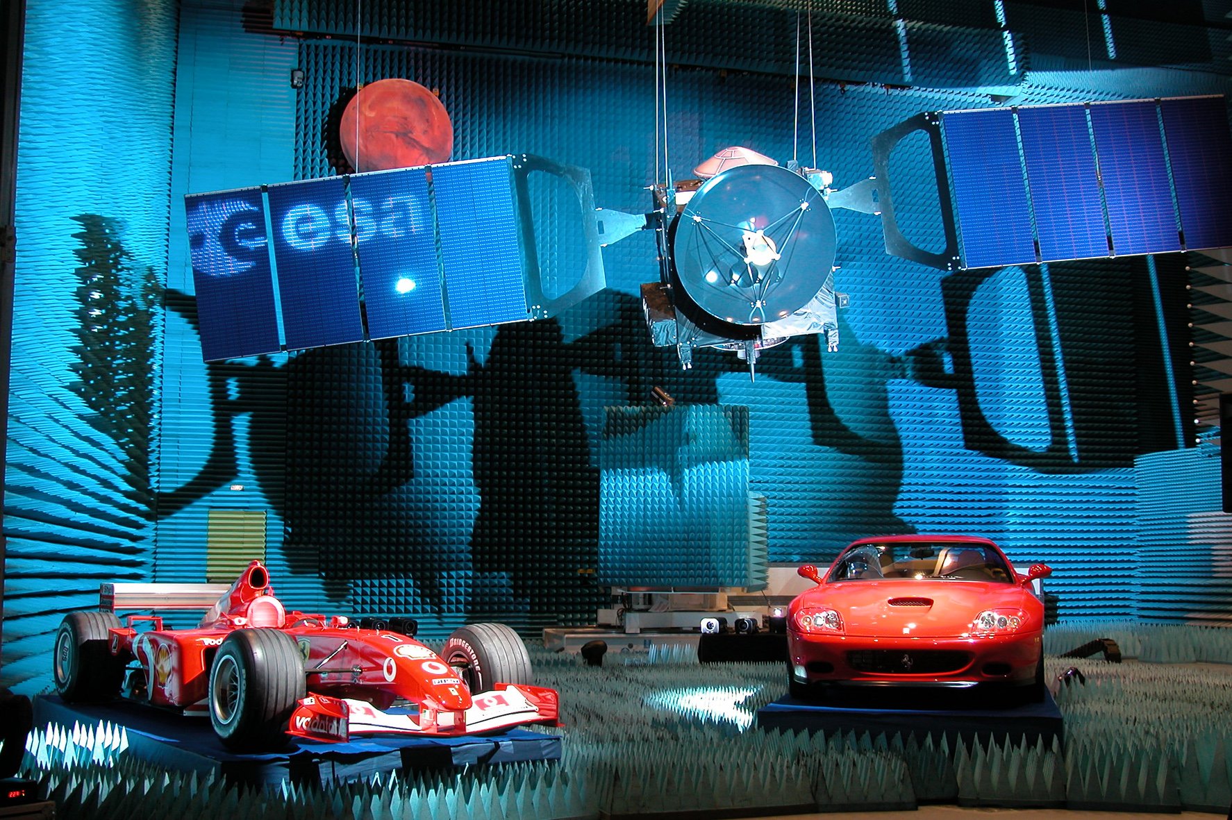Pictured here: A life size model of the European Mars Express spacecraft due to be launched on its journey to the Red Planet in May-June 2003 accompanied by a sample of Ferrari red paint. The model of the spacecraft is seen here in the anechoic chamber at INTESPACE in Toulouse, alongside the F2002, this year's Ferrari F1 World Champion car together with Ferrari's 575M Maranello.