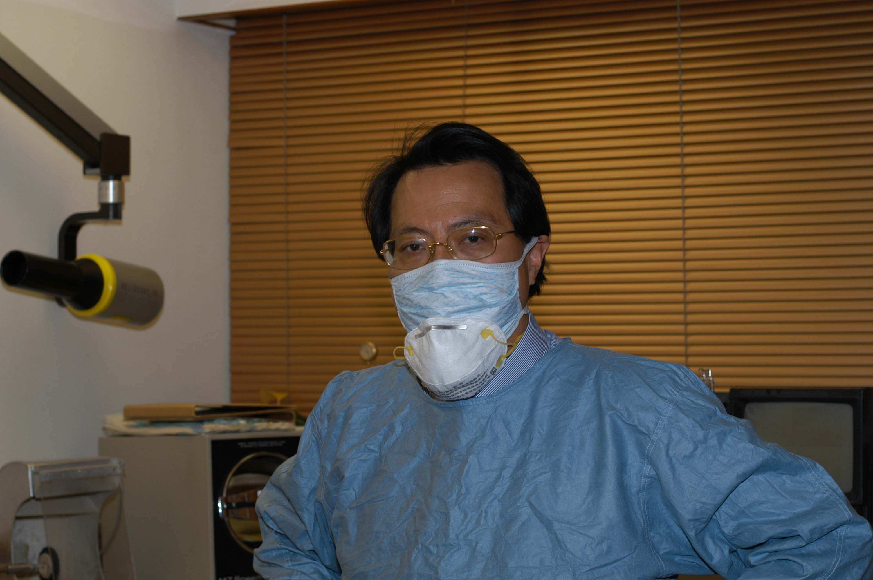 Dr Ng is wearing a double mask because of the Severe Acute Respiratory Syndrome (SARS) lung sickness. A dental X-ray machine is visible behind him.