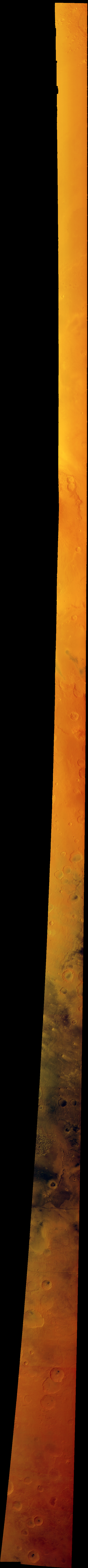 The image shown is a section of the Gusev crater region, the landing site of the NASA Spirit rover. The full image, which can be viewed by downloading one of the high resolution image, covers 3700 kilometres north to south and is up to 166 km wide.