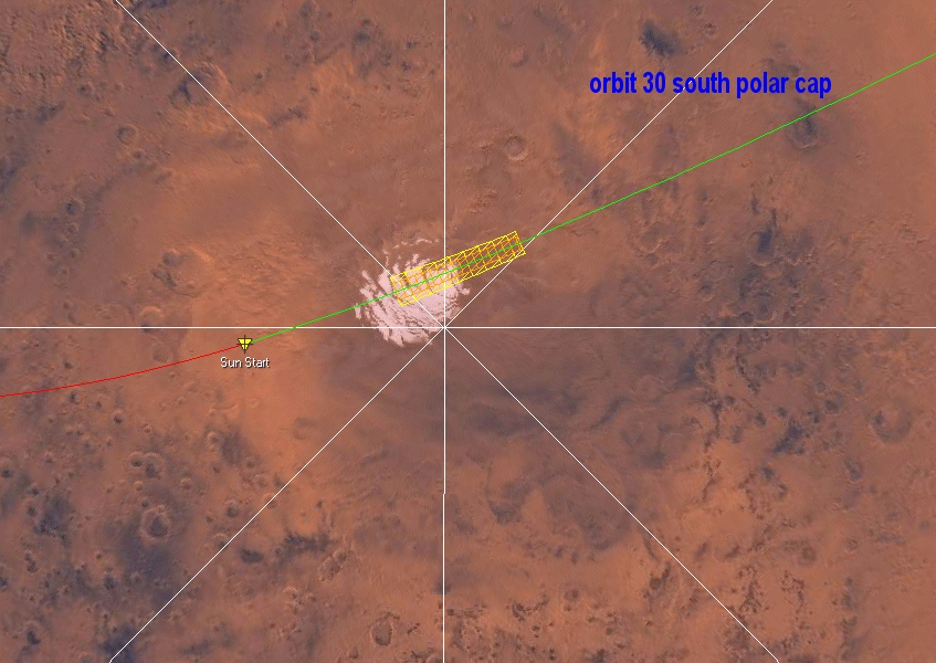 The southern polar cap with the ice cap clearly visible. Overlayed is the footprint of the PFS measurements from orbit 30. Analysis of the data from these observations indicates some water is mixed in with carbon dioxide ice.