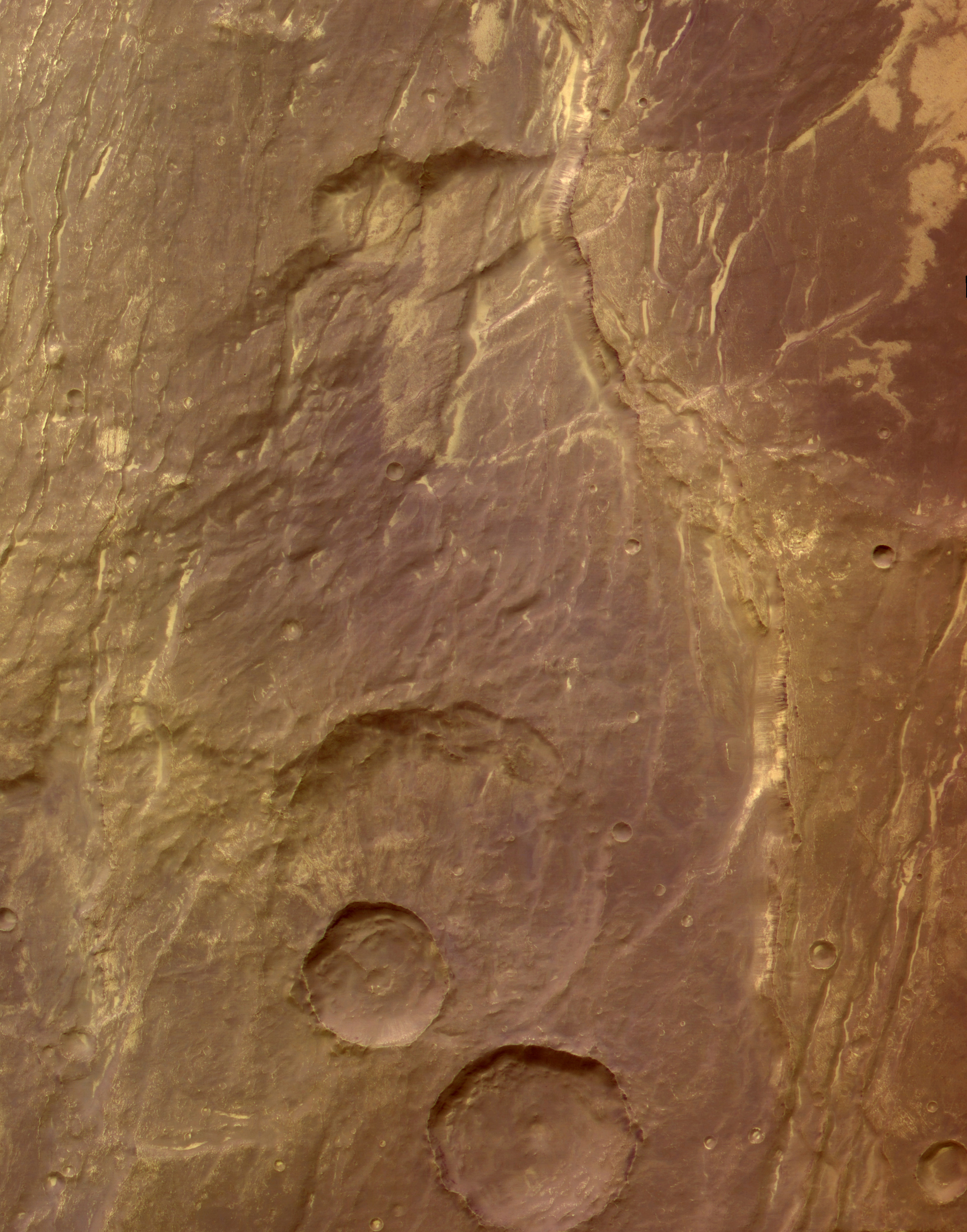 This image was taken by the High-Resolution Stereo Camera (HRSC) on Mars Express in orbit 68 from an altitude of 271 km. The resolution is about 17 metres per pixel and shows a region called Claritas Fossae on Mars, centred at 255.7° East and 30.9° North. North is on the left. The Claritas Fossae are an ancient tectonic region west of Solis Planum, a tectonic and volcanic area south-east of the Tharsis volcano group.