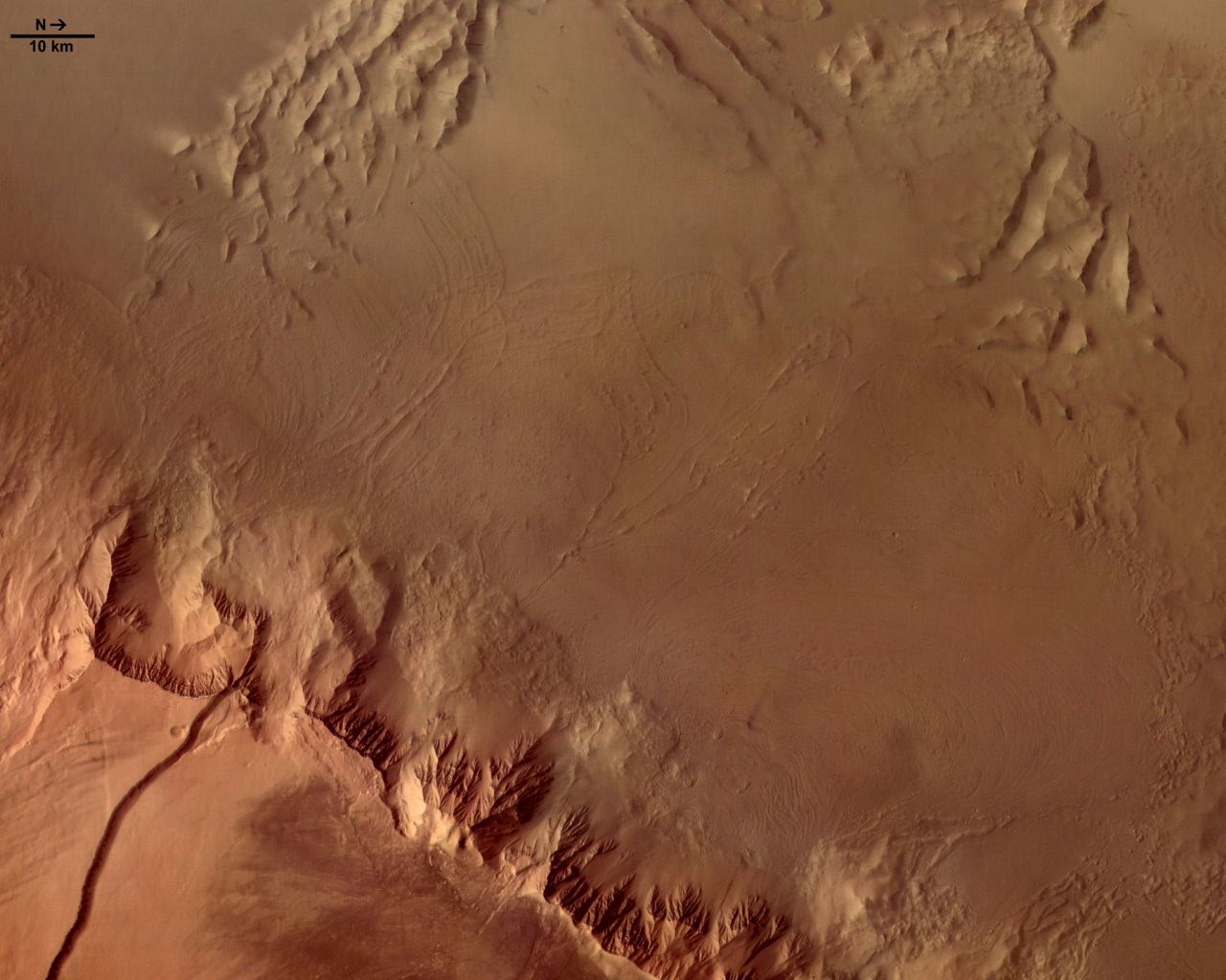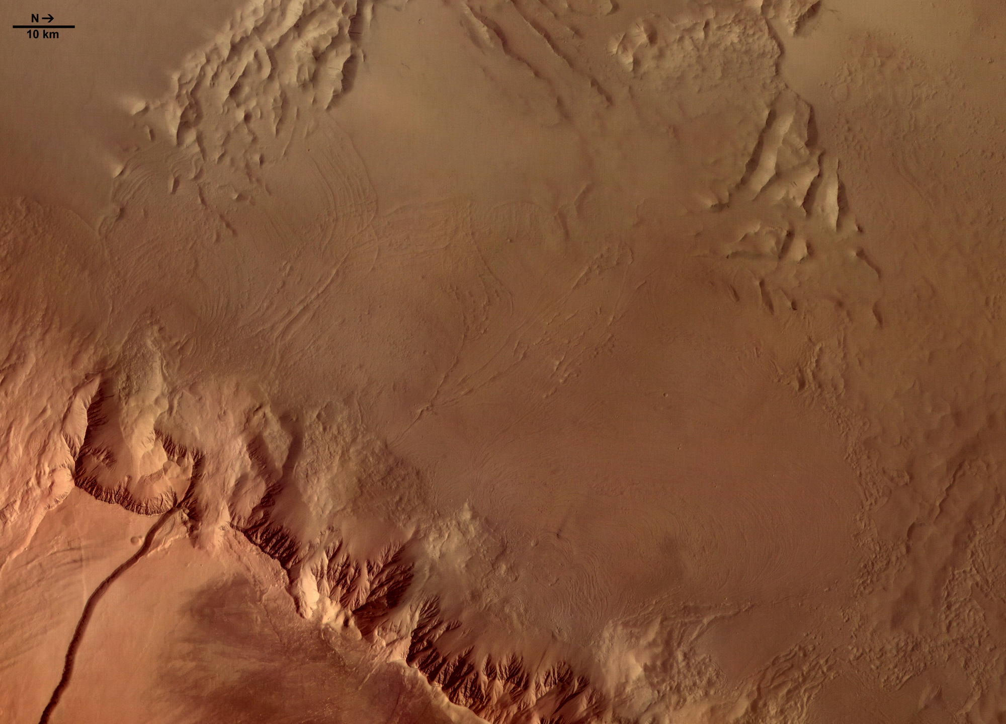 At the top of the image, part of the extensive plains west of the escarpment are shown, known as the 'aureole' (from the Latin for 'circle of light'). To the north and west of the volcano, these 'aureole' deposits are regions of gigantic ridges and blocks extending some 1000 kilometres from the summit.