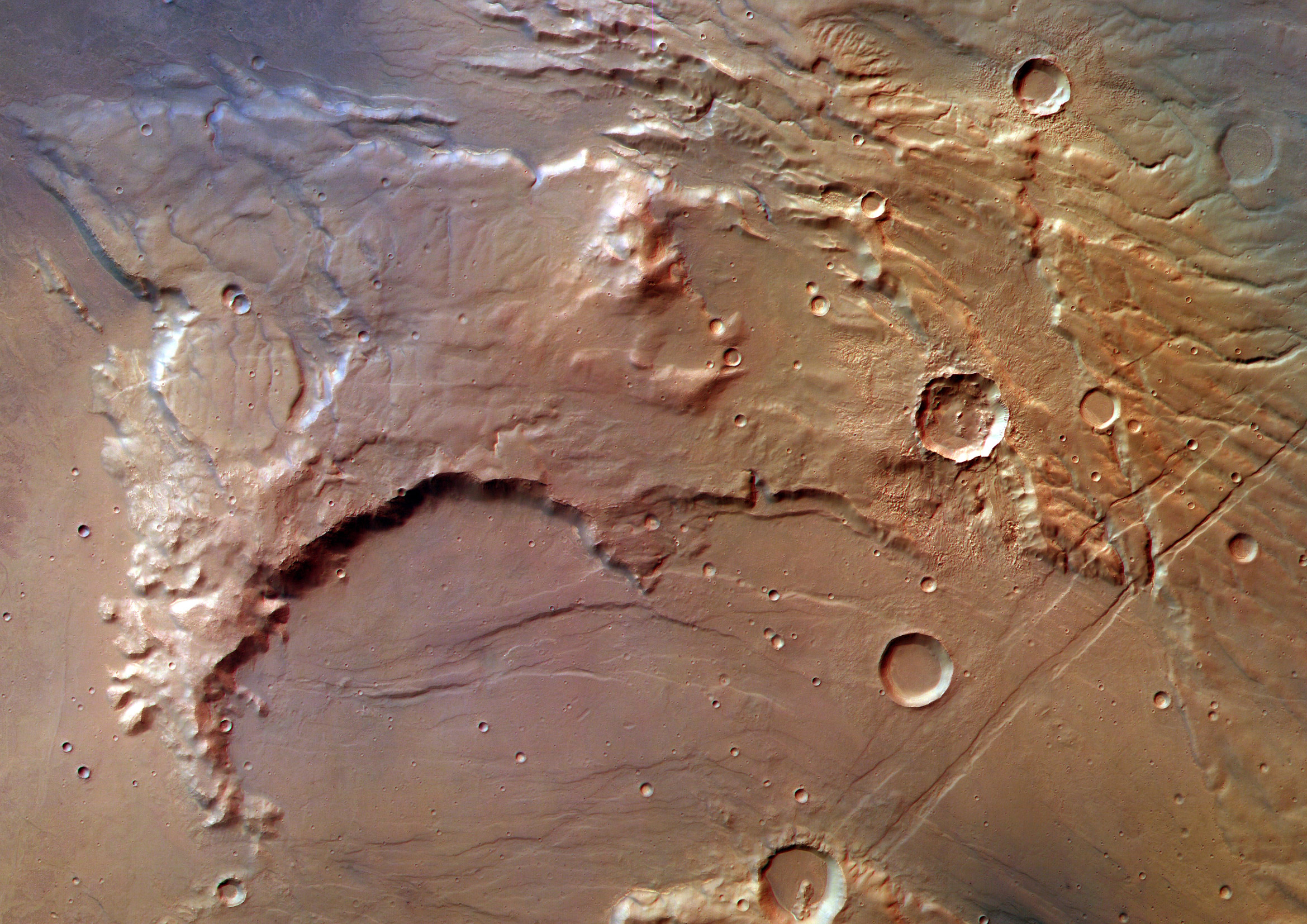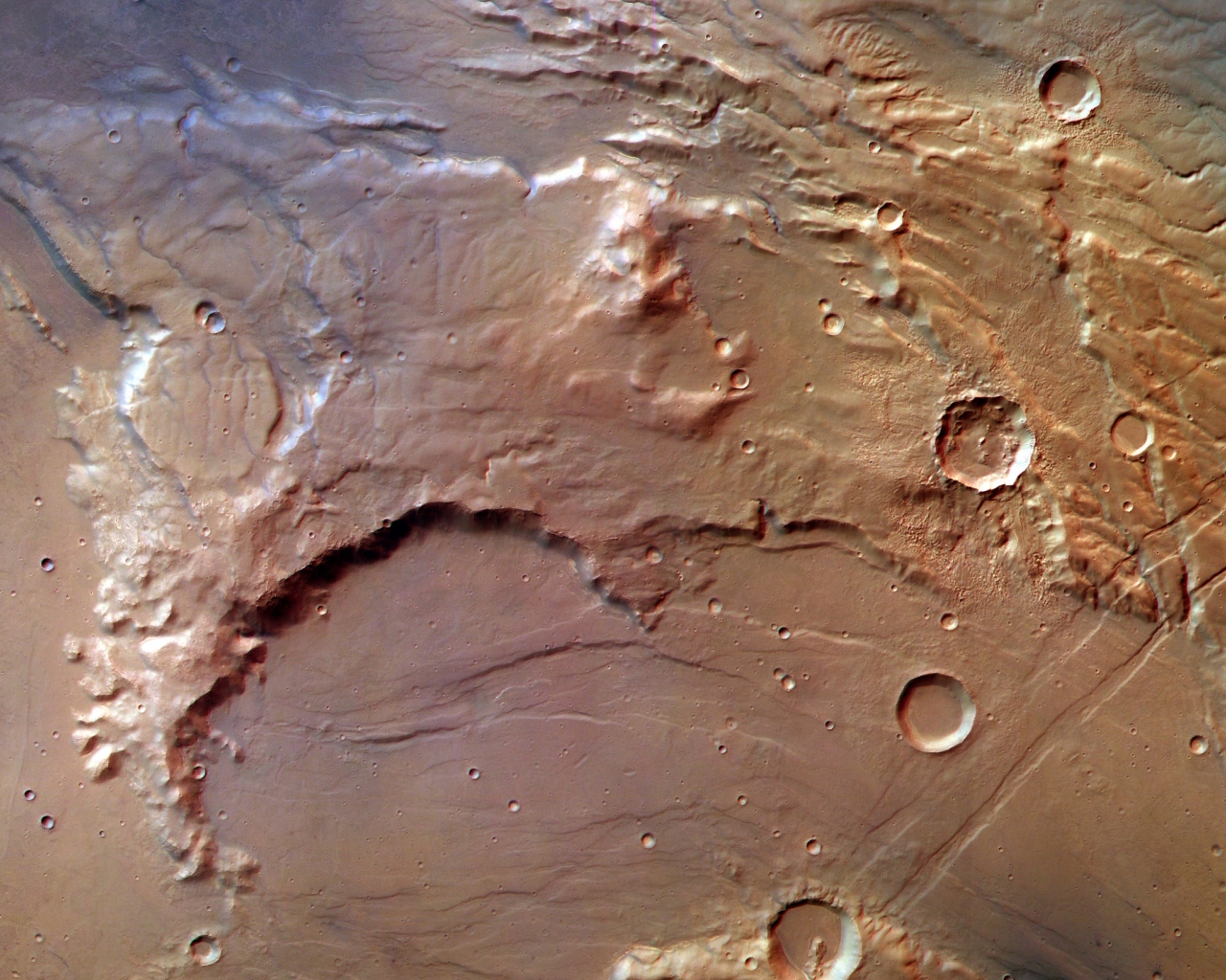 The northern end of the higher region, or upper left in this image, contains an almost circular plateau, which is 15 kilometres across. It may be an old impact crater, filled by sediments, which developed a harder consistency than the surrounding material over the course of time. Later, the more easily eroded material was removed and the harder inner filling remained. This phenomenon is called 'inverted relief'.