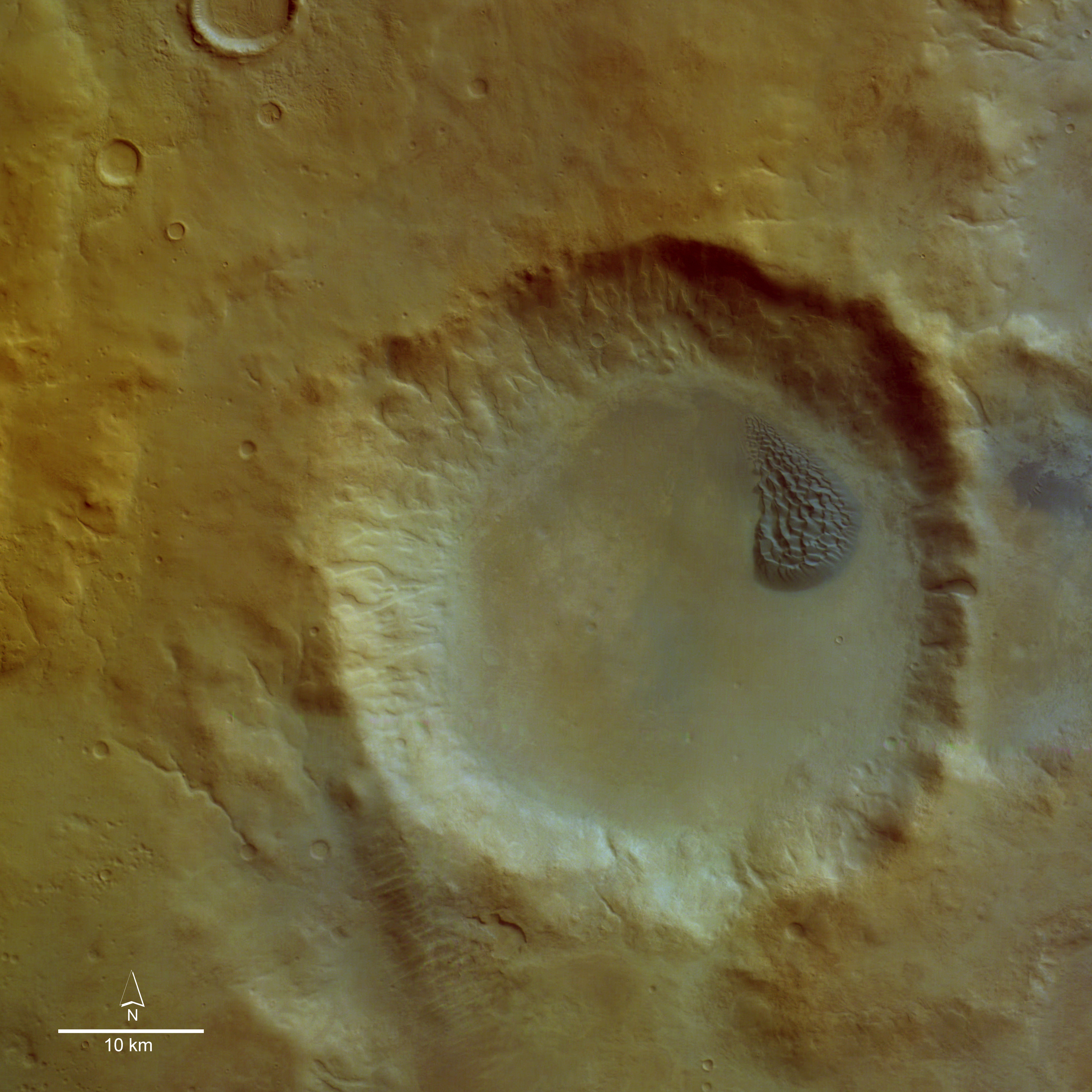 The crater is about 45 kilometres wide and 2 kilometres deep. In the north-eastern part of this crater, the complex dune field is 7 kilometres wide by 12 kilometres long. In arid zones on Earth, these features are called "barchanes", which are dunes having an asymmetrical profile, with a gentle slope on the wind-facing side and a steep slope on the lee-side. The dune field shown here suggests an easterly wind direction with its steeper western part. The composition of the dune material is not certain, but the dark sands could be of basaltic origin.