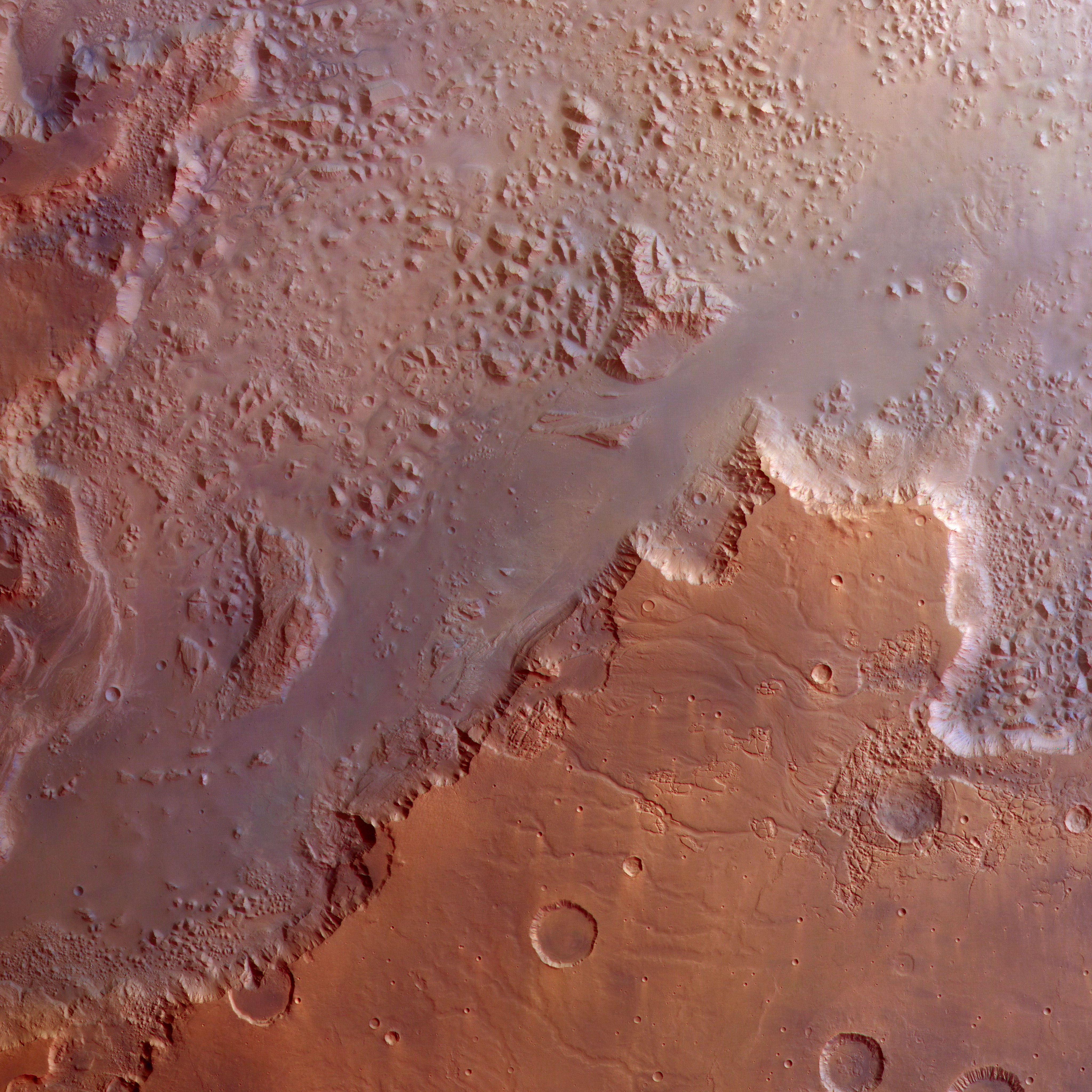 The northern part of Eos Chasma's valley floor is a rough area with angular hills reaching almost 1000 metres. In contrast, the southern part reveals a smooth topography with distinct flow structures. In some areas of the southern slope, at least two terrace levels can be observed. Some haze in the valley hints at the presence of aerosols (airborne microscopic dust or liquid droplets).