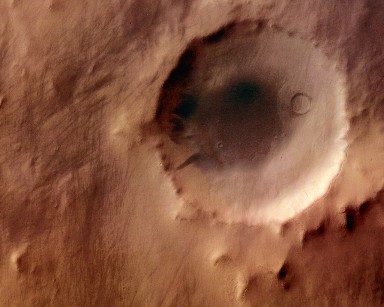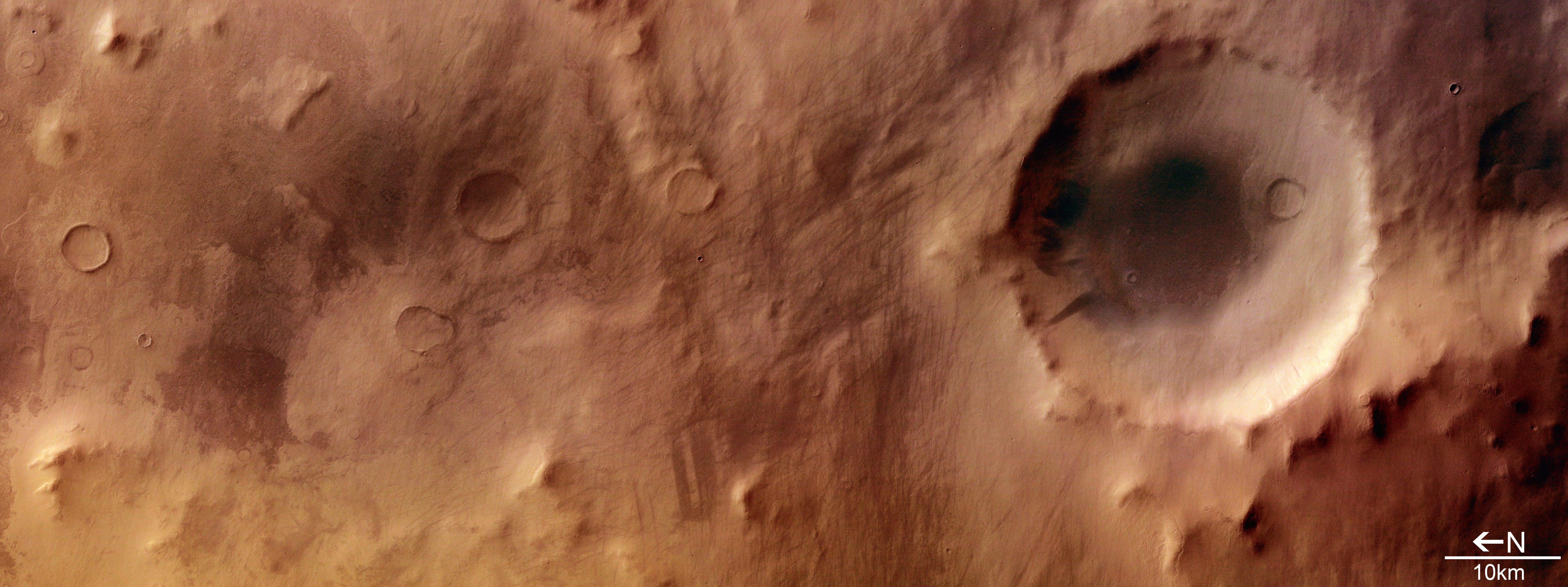 The large impact crater in the southern part of the image is 32 kilometres wide and up to 1200 metres deep. The dark crater floor is most likely the result of "deflation", the geological term for the lifting and removal of loose material. The dust removed here has accumulated in the southern part of the crater, forming a thick layer. The numerous dark tracks to the north-western and west are "dust devil" tracks. These atmospheric eddies, like tornadoes on Earth, remove the uppermost dust layers which have a slightly different colour to the now-exposed surface. The tracks can be more than 20 kilometres long and contrast prominently with the lighter-coloured surroundings.