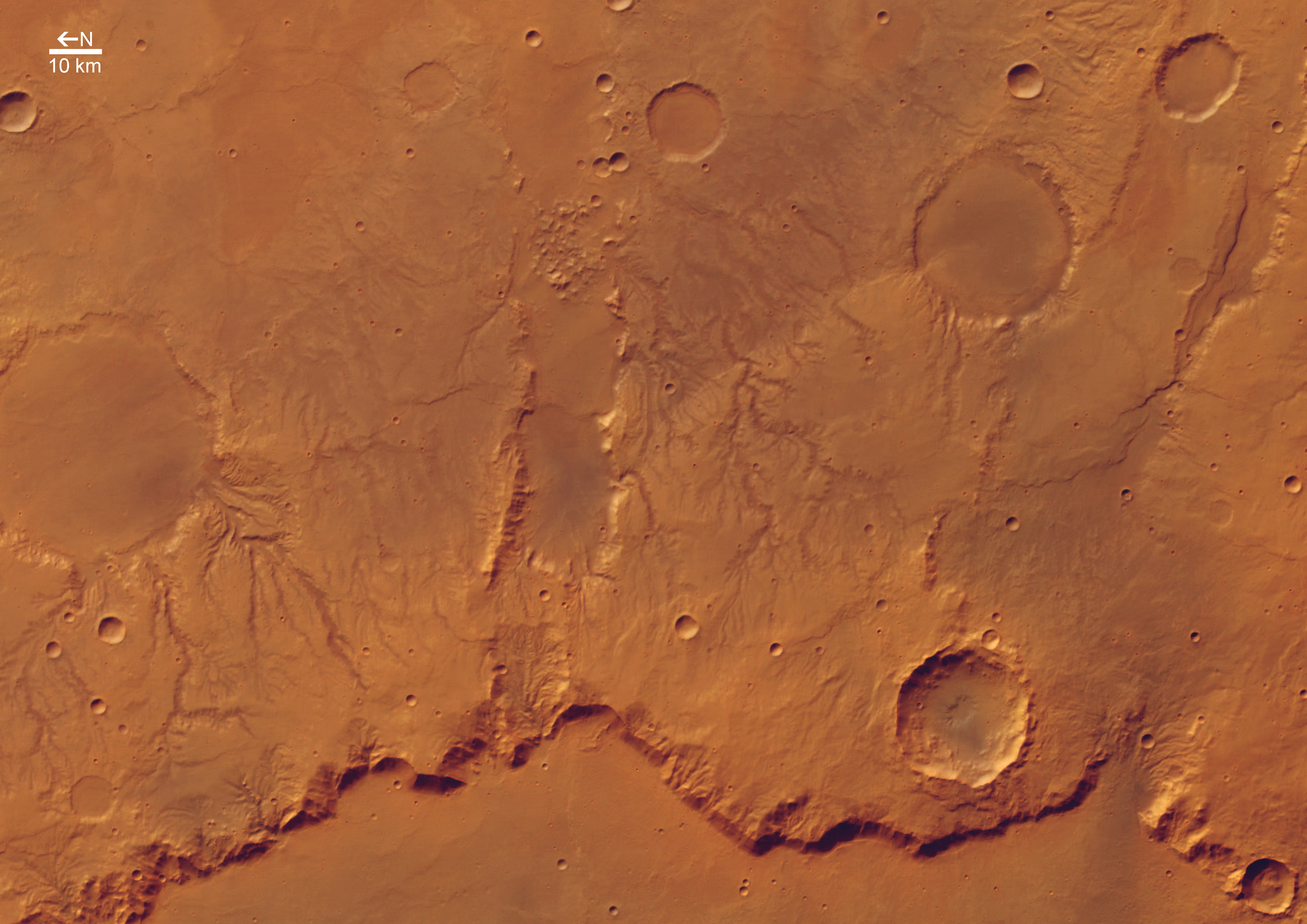 The above image of the eastern rim of the Martian impact crater Huygens was taken during orbit 532 on 20 June 2004 by the High Resolution Stereo Camera (HRSC) on-board Mars Express with a ground resolution of approximately 70 metres per pixel. The displayed region is centred on longitude 61° East and latitude 14° South. The image was processed using the nadir (vertical view) and colour channels. Image resolution has been decreased for use on the internet.