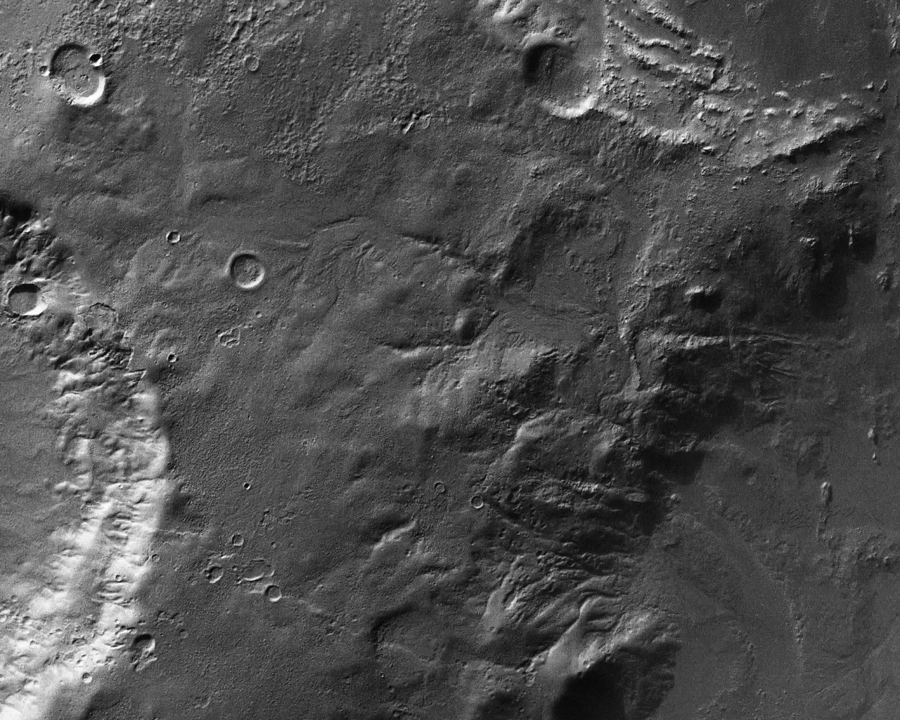 This image, taken by the High Resolution Stereo Camera (HRSC) on board ESA's Mars Express spacecraft, shows the surface near the western rim of Crater Hale in the Argyre basin of the southern hemisphere of Mars. It was taken with a ground resolution of about 40 metres per pixel during Mars Express orbit 533 in June 2004.