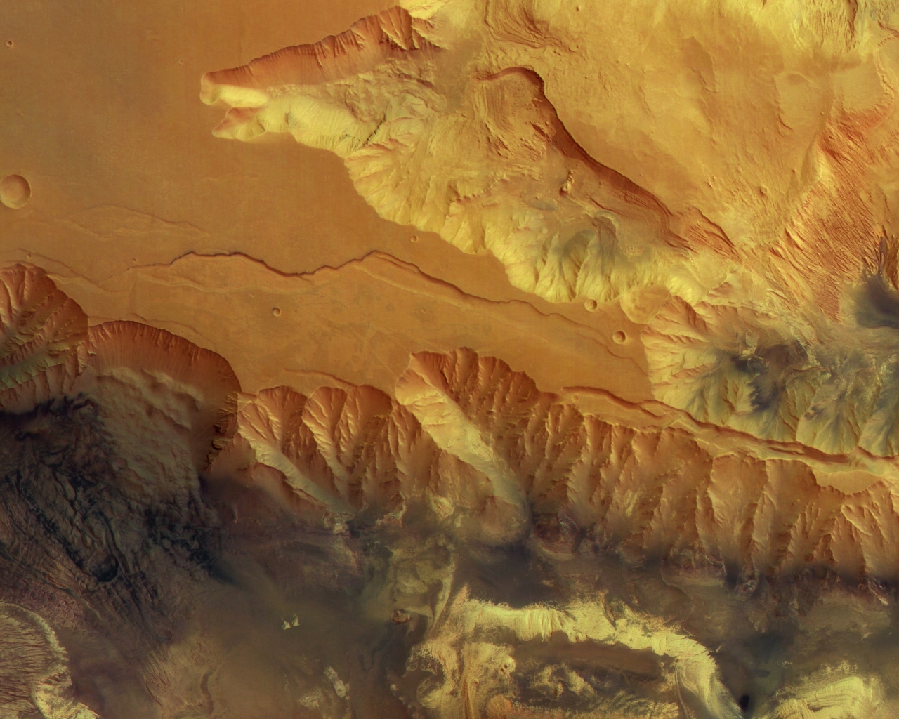 It could also be possible that large amounts of ice under the surface melted and this meltwater formed the large outflow channels in the north. As a result, the surface collapsed where substantial amounts of ice were removed, forming the Valles Marineris system as we see it today.