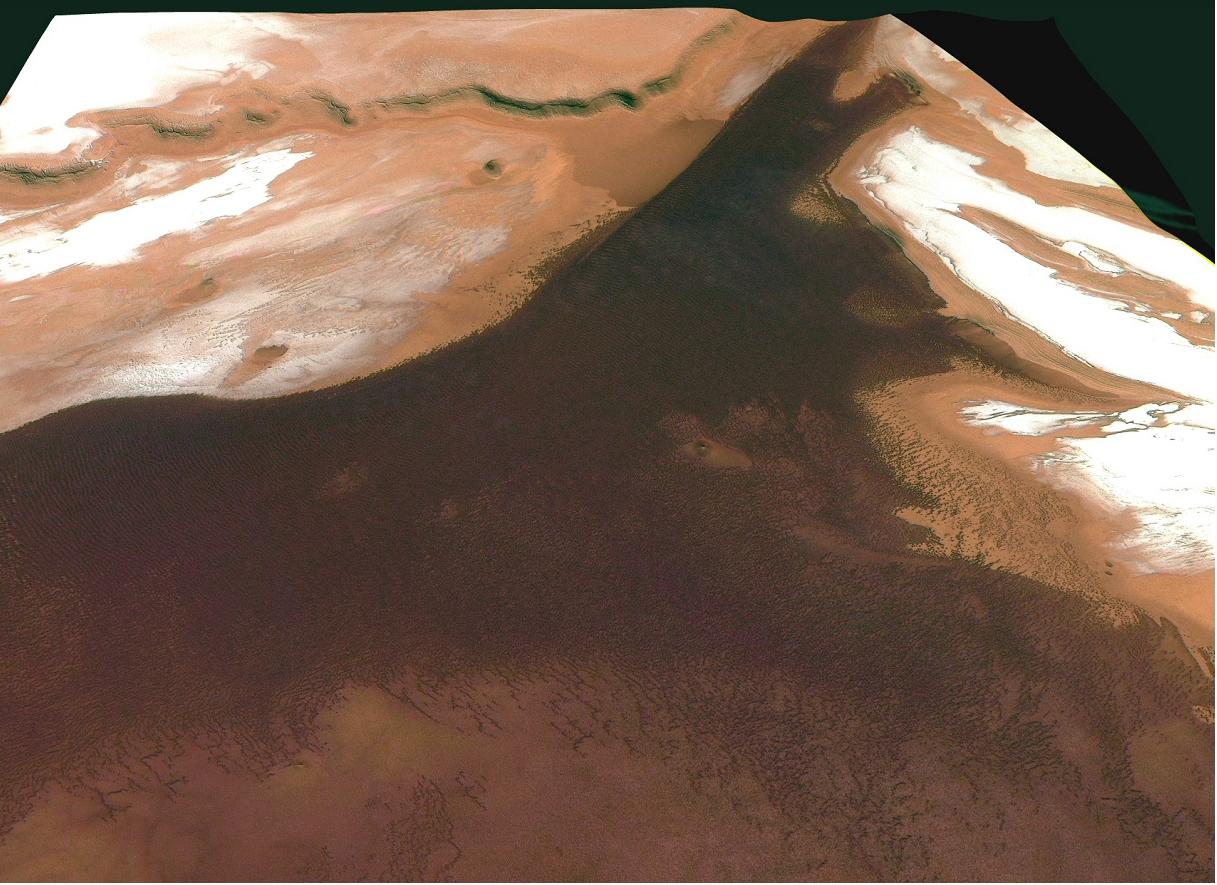 In this image, taken at the Martian north pole, the Mars Express spacecraft saw fields of volcanic cones. Some are up to 600 metres high. They appear to indicate very recent volcanic activity, but the question remains, whether it is on-going activity.
