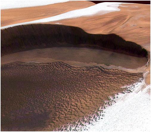 Here we see cliffs which are almost 2 kilometres high, and the dark material in the caldera-like structures and dune fields could be volcanic ash.