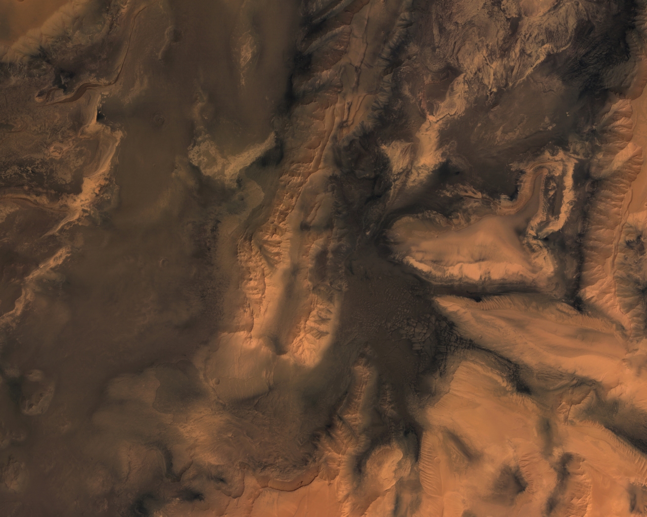 In contrast, some gigantic hills (indeed, between 1000 and 2000 metres high) located on the floors of the valleys have a smoother topography and a more sinuous outline. So far, scientists have no definitive explanation for why these different landforms exist.