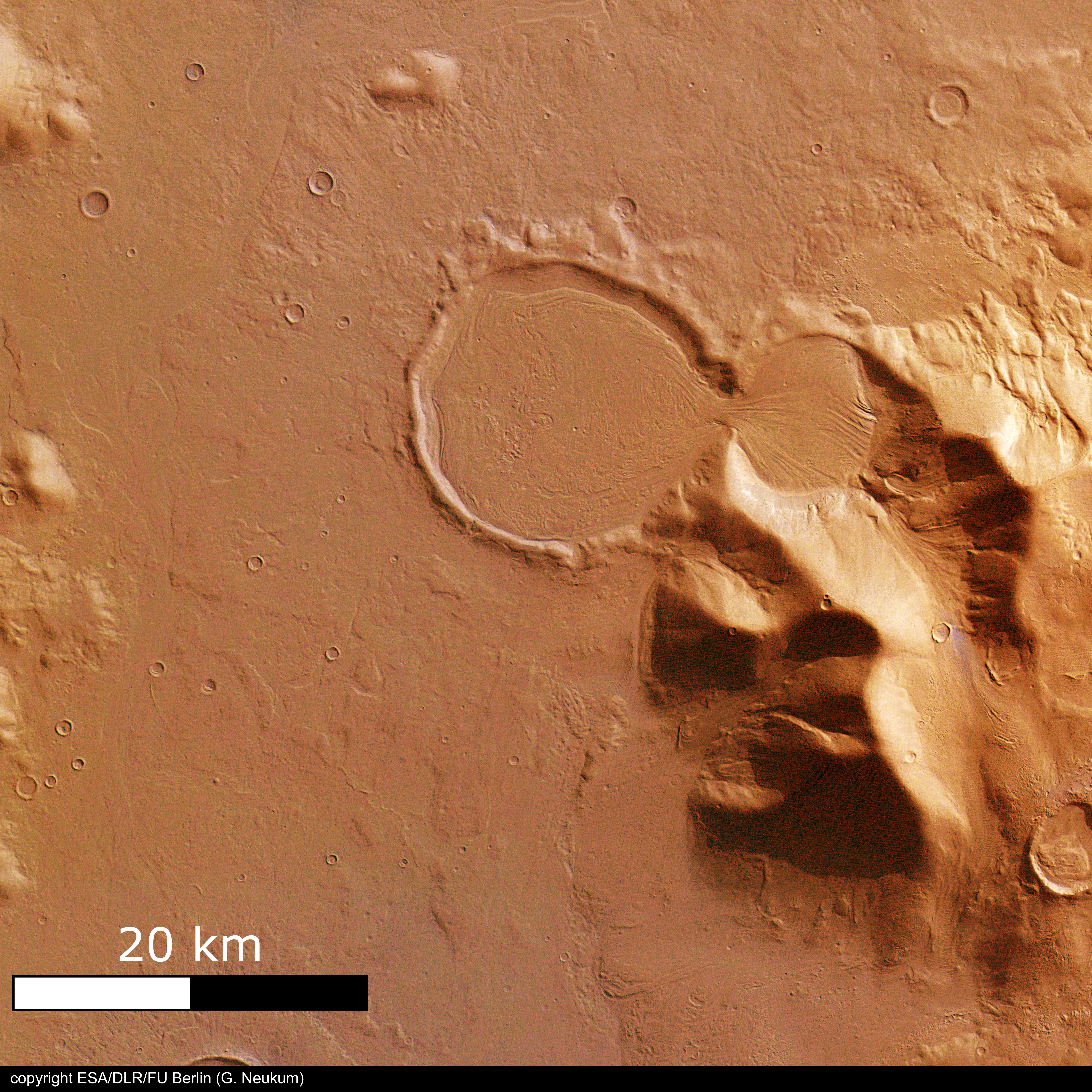 A so-called block glacier, flowed from a flank of the massif, past mountains several thousand metres high, into a bowl-shaped impact crater, nine kilometres wide, which has been filled nearly to the rim (right). The block glacier then flowed into a 17 kilometre wide crater (left), 500 metres below, taking advantage of downward slope.