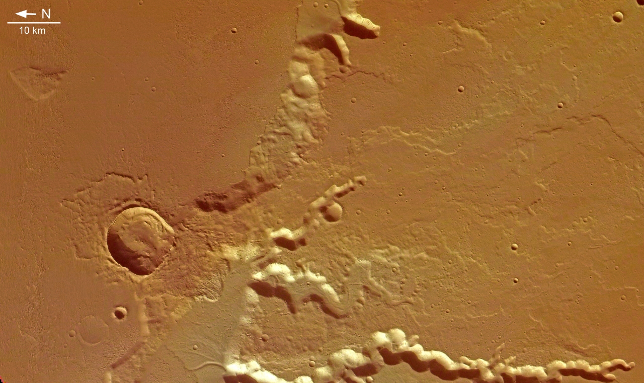 The HRSC obtained this image during orbit 917 with a resolution of approximately 13 metres per pixel. It shows an area located at about 5° South and 213° East. The colour image is derived from the three HRSC colour channels. The Medusa Fossae formation is an extensive unit of enigmatic origin found near the Martian highland-lowland dichotomy boundary between the Tharsis and Elysium centres of volcanic activity.