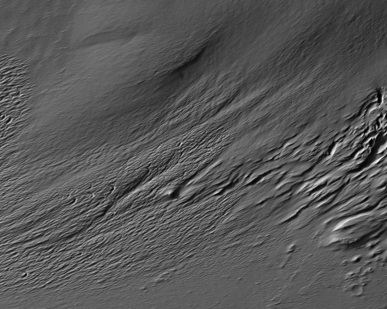 This image, taken by the High Resolution Stereo Camera (HRSC) on board ESA’s Mars Express spacecraft, shows a detail of the Medusa Fossae formation. The Amazonis Sulci, with its ridges and grooves, appears to be wind-sculpted. The lack of craters superposing this surface indicates that wind erosion has been the latest stage of eroding processes acting here.