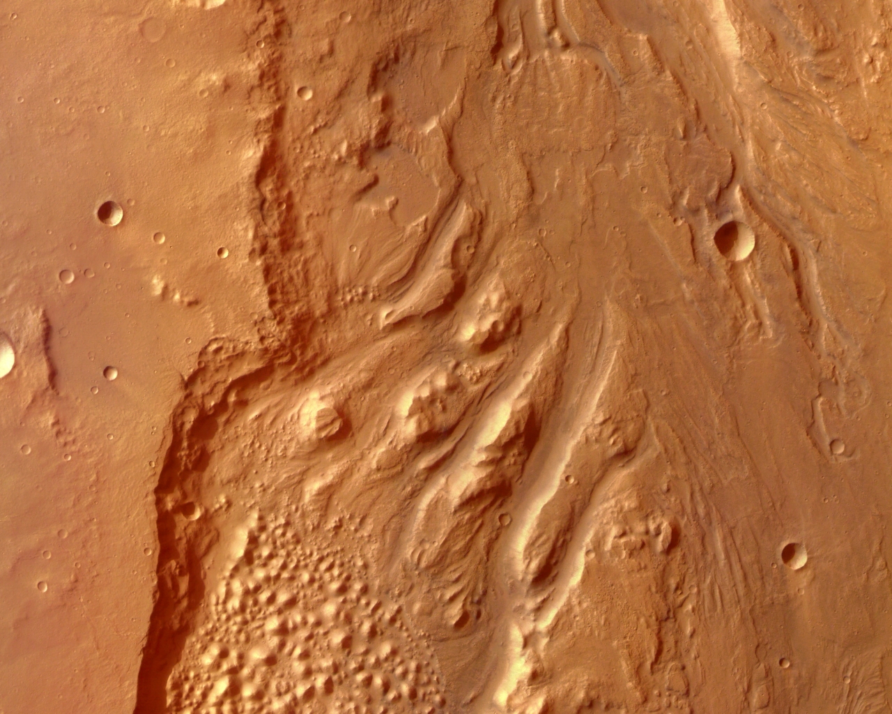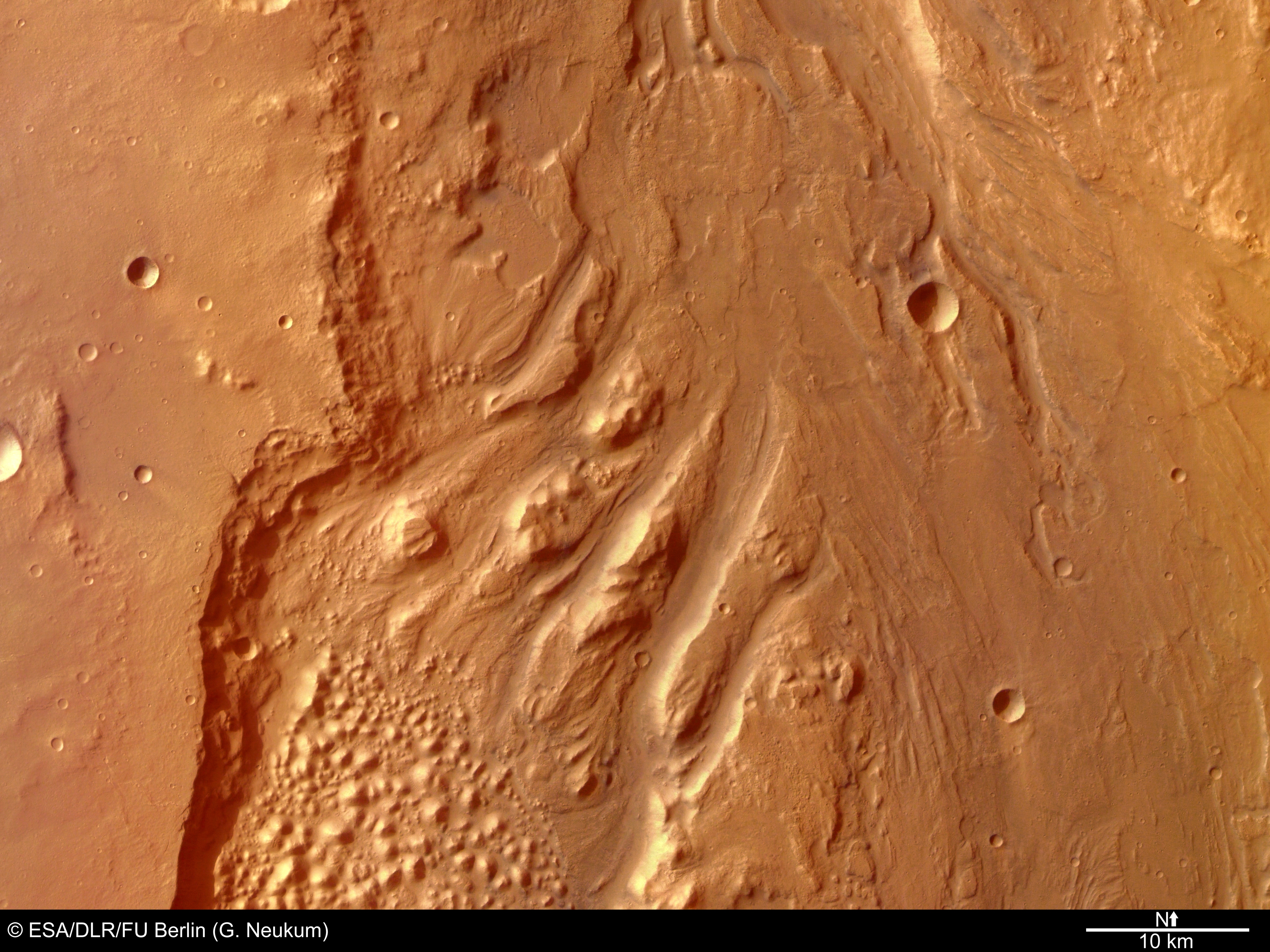 The image shows the transition zone between Iani Chaos and Ares Vallis. Ares Vallis is one of several big outflow channels on Mars in this region that formed billions of years ago. Many surface features suggest that erosion of large water flows had carved Ares Vallis in the Martian landscape. Most likely gigantic floods ran downhill, carving a deep canyon into Xanthe Terra. Rocks eroded from the valley flanks were milled into smaller fractions and transported in the running water.