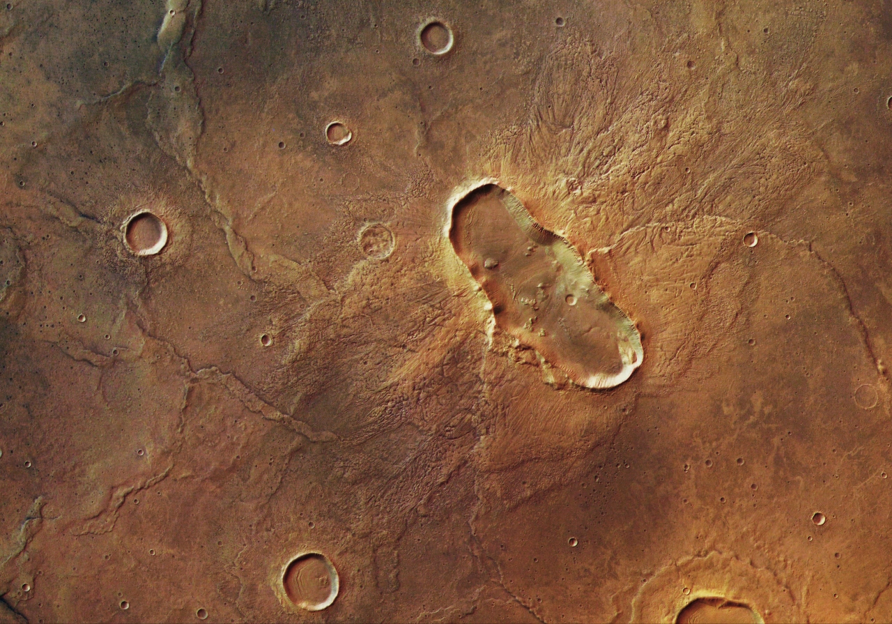 This image, taken by the High Resolution Stereo Camera (HRSC) on board ESA's Mars Express spacecraft, shows a large elliptical impact crater in the Hesperia Planum region of Mars.