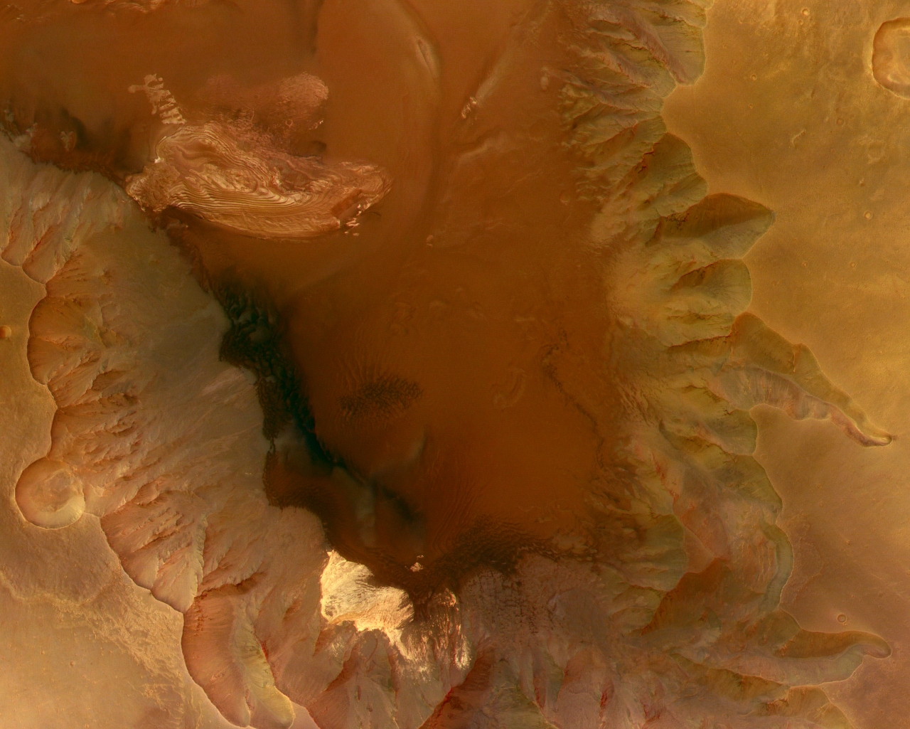 In the north-eastern part of the scene, there is a mountain composed of bright, layered material. This mountain is approximately 2500 metres high, 59 kilometres long and up to 23 kilometres wide.