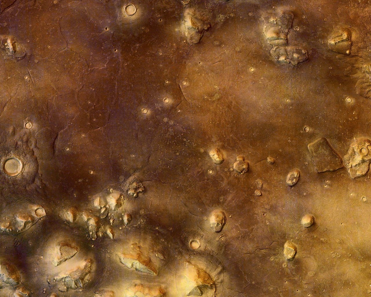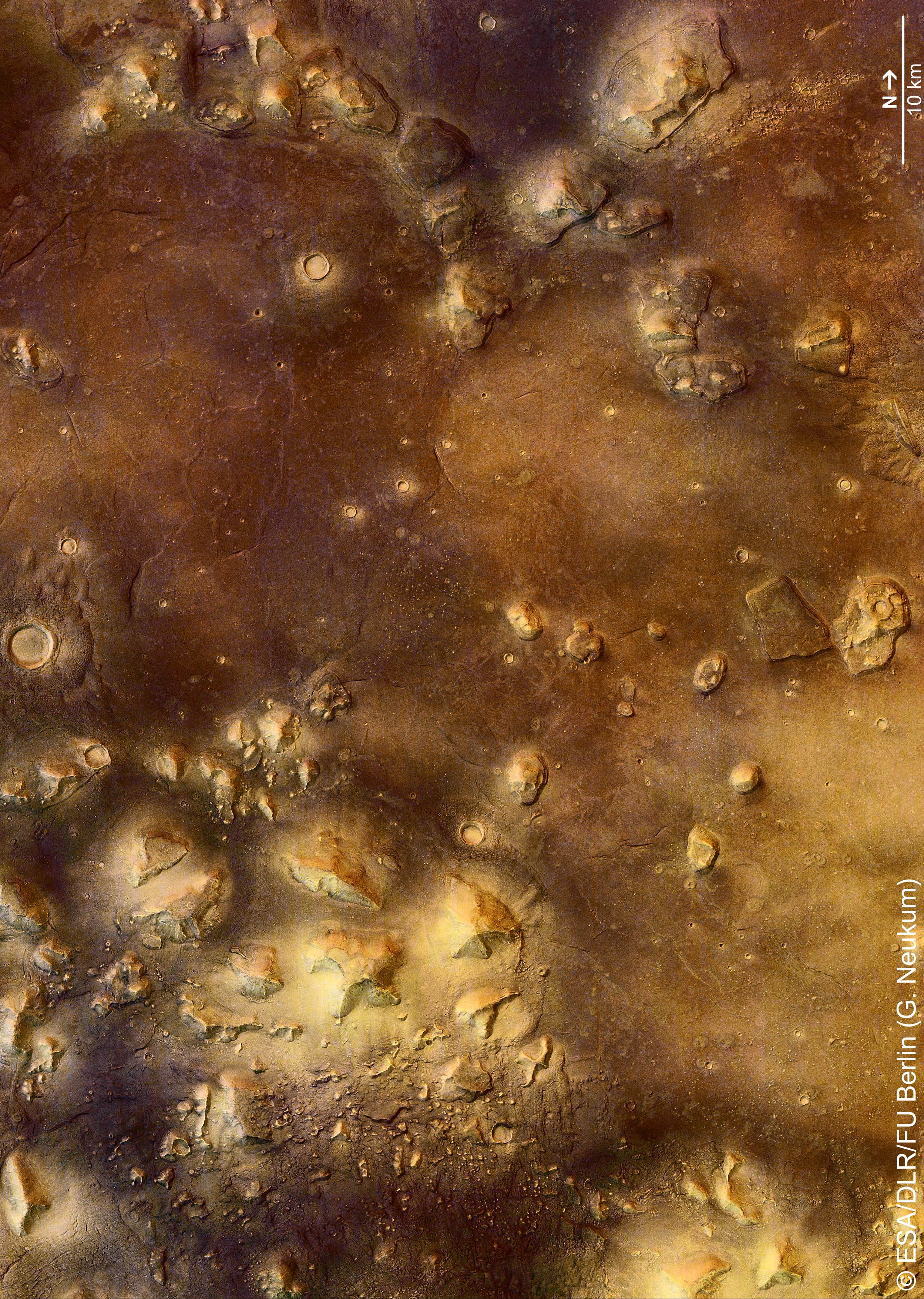 An overhead view of the Cydonia region, obtained with the HRSC instrument on board Mars Express. North is up. The massif that is popularly known as the face on Mars lies just right of the center of the image.