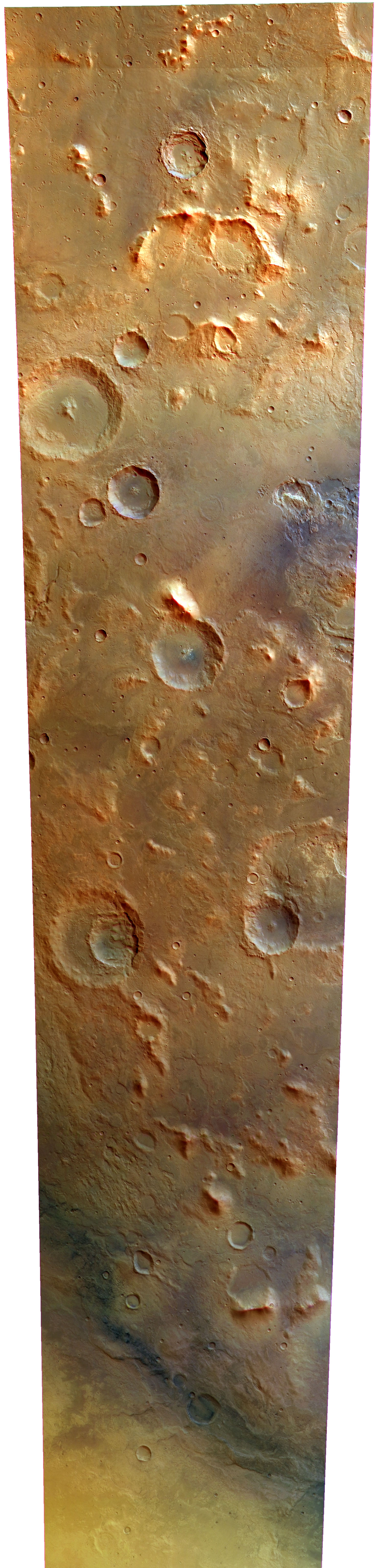 This image was obtained by the High-Resolution Stereo Camera (HRSC) during Mars Express' 411th orbit. The view shows a strip across the transition region between the extensive land mass Tyrrhena Terra, in the upper half of the image, and the large Hellas impact basin. The northern edge of the Hellas basin can be seen running diagonally across the image in the lower half of the image.