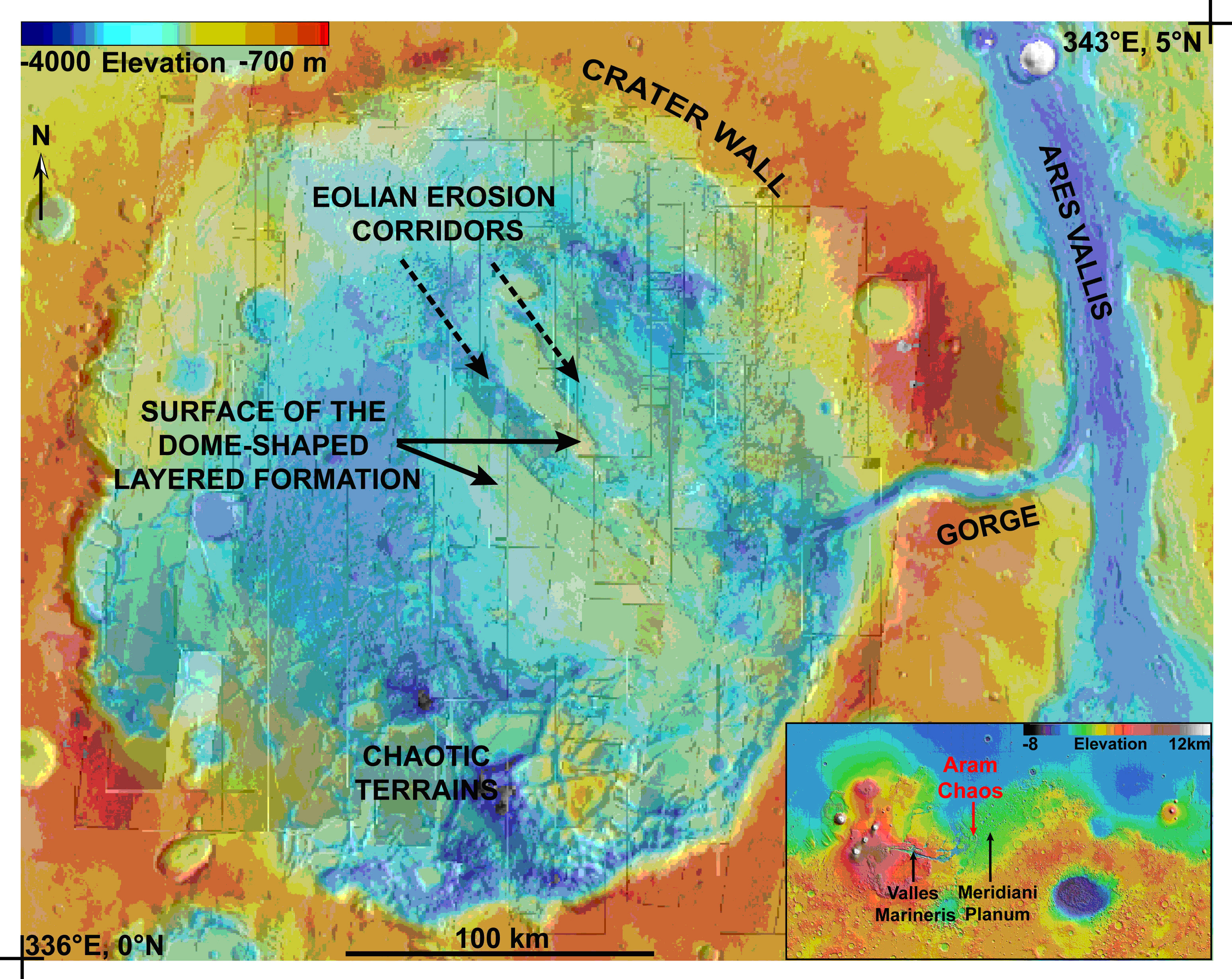 This morphological map of Aram Chaos is constructed from a superposition of a MOLA digital elevation model on a mosaic of visible THEMIS images. The inset indicates the location of Aram Chaos on a MOLA topographic map