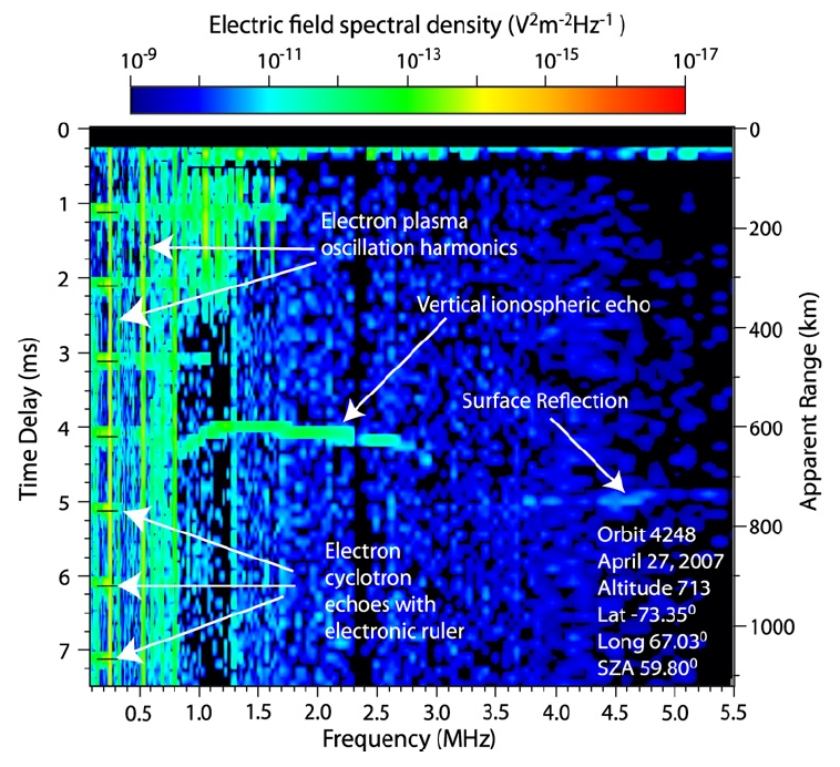 MARSIS sounding measurements of the ionosphere are plotted in an ionogram. The intensity of the reflected signal is colour coded. The time delay between transmission of the pulse by the MARSIS electric dipole antenna and the detection of the reflected signal is along the vertical axis. The frequency of the transmitted pulse is along the horizontal axis.
