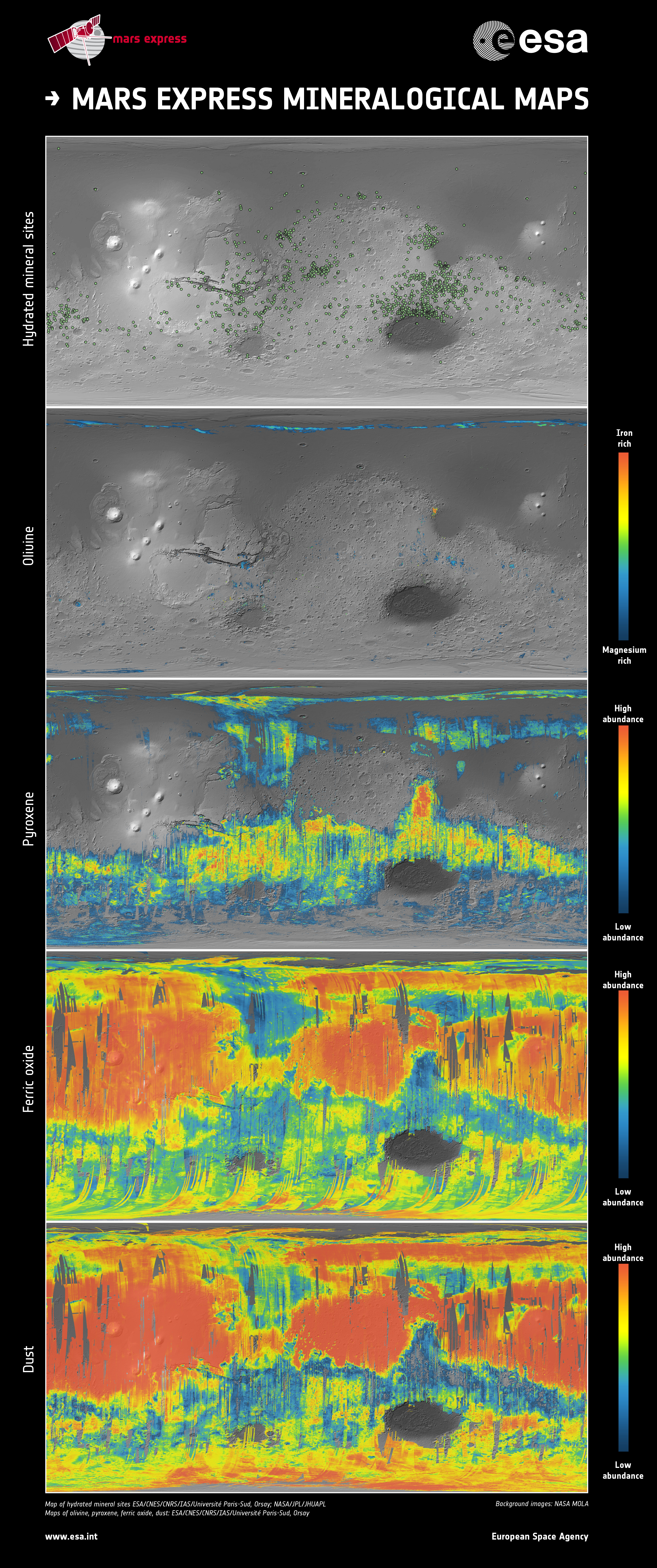 Credit: ESA/CNES/CNRS/IAS/Université Paris-Sud, Orsay; NASA/JPL/JHUAPL; Background images: NASA MOLA