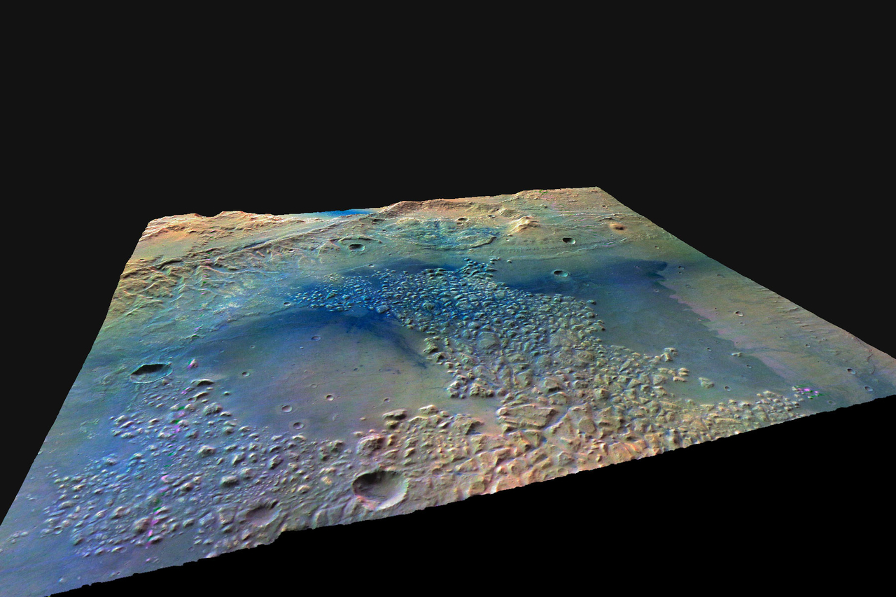 This scene shows a perspective view of the Atlantis Chaos basin, one of four basins studied in a paper published in the Journal of Geophysical Research. This false-colour image was put together using four strips of images produced by the High Resolution Stereo Camera (HRSC) on ESA's Mars Express.