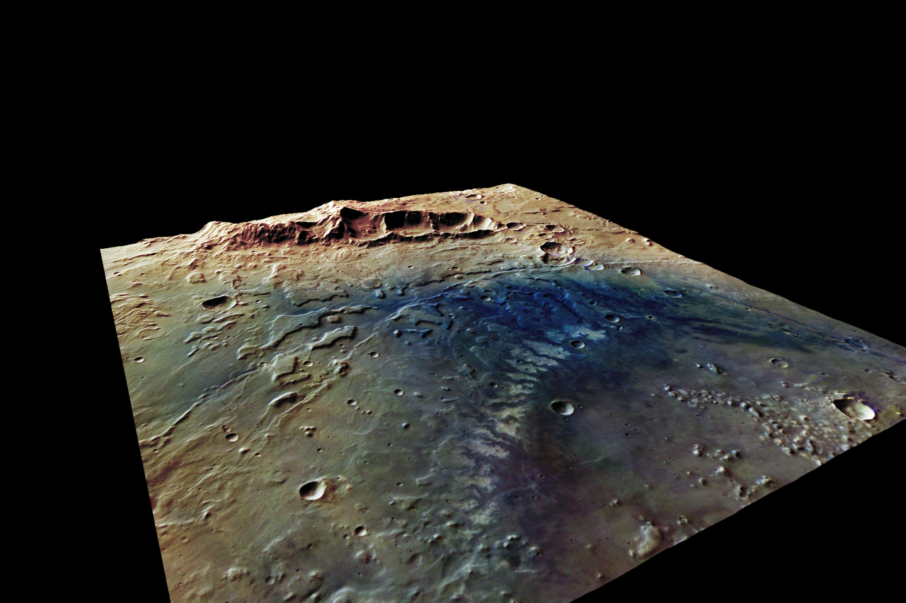 This scene shows a perspective view of the Simois Colles basin, one of four basins studied in a paper published in the Journal of Geophysical Research. This false-colour image was put together using four strips of images produced by the High Resolution Stereo Camera (HRSC) on ESA's Mars Express.