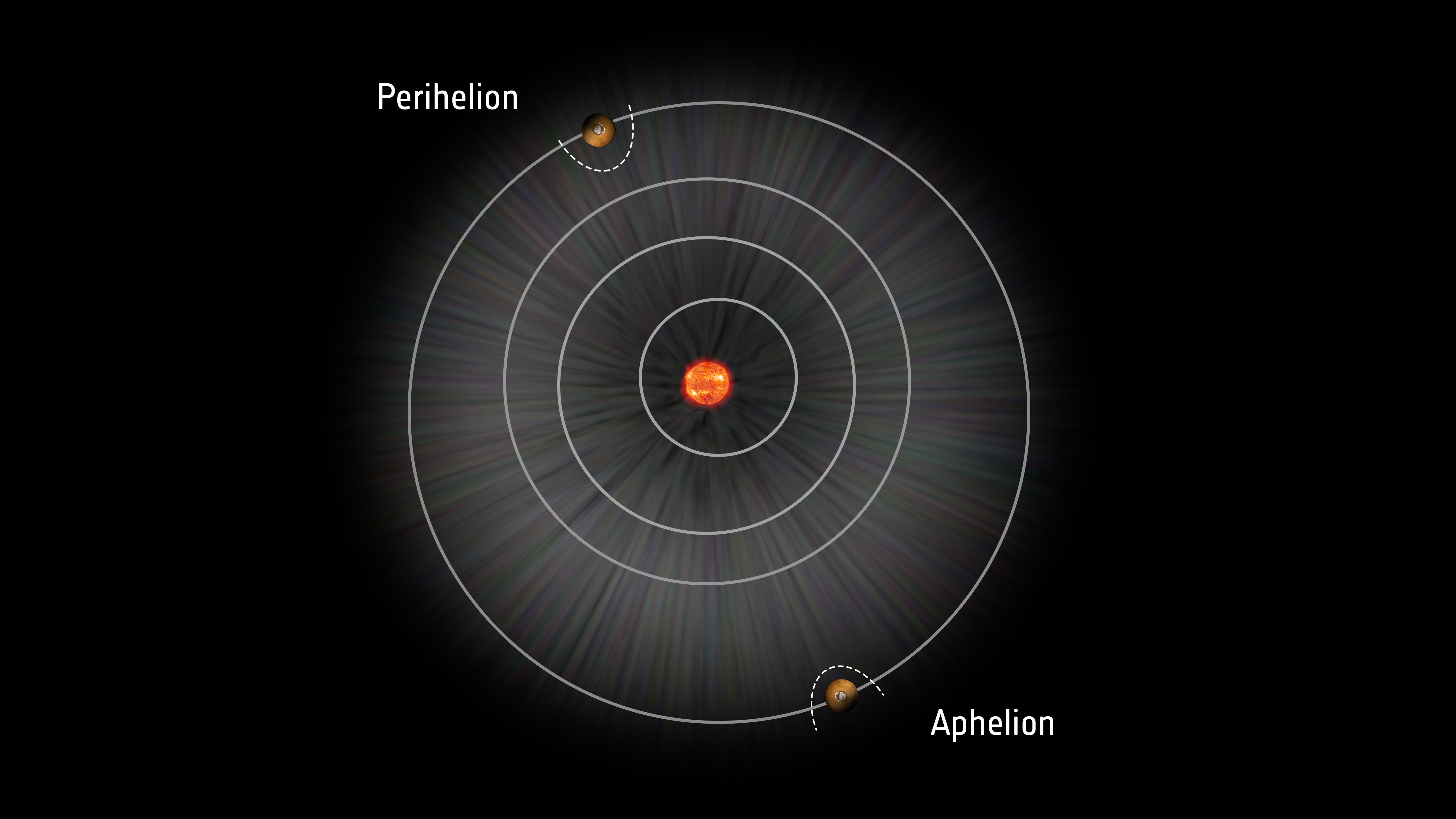 On average, the bow shock is closer to Mars near aphelion (the planet's furthest point from the Sun), and further away from Mars near perihelion (the planet's closest point to the Sun).