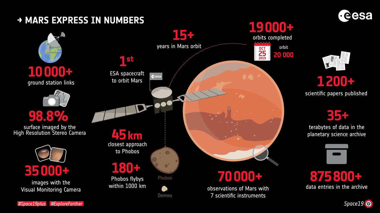 Launched in June 2003, ESA's Mars Express has been studying all aspects of the Red Planet for more than 15 years. Later this year it will celebrate its 20 000th orbit of Mars. This graphic highlights some of the mission's impressive numbers to date, which will certainly continue to increase over time.