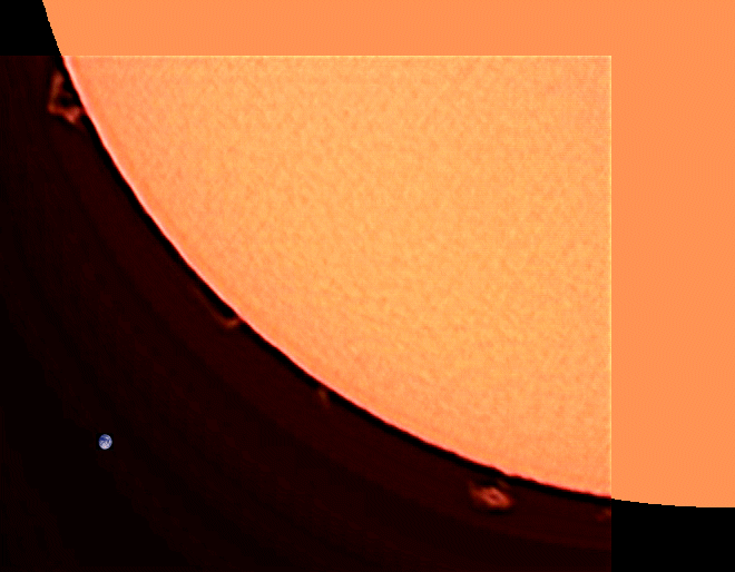 This movie was taken during the annular solar eclipse on 3 October 2005, through an H-alpha filter, showing part of the solar disk with prominences. A graphic of the Earth to scale has been included for reference.