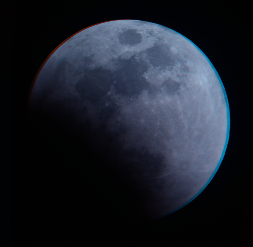 An anaglyph showing the Lunar Eclipse in 3D from coordinated observations by Leonardo Julio, Alejandro Tombolini and Adriana Fernández from Arenales y Agüero, Capital Federal, Argentina and Manuel Castillo at ESAC.