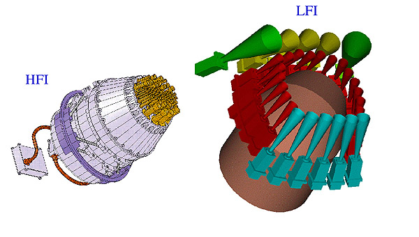 The focal plane units for the LFI and HFI, which will be located at the focus of the Planck telescope. The HFI unit is inserted into the ring formed by the LFI (conical shaped) horns. Radiation from the telescope is collected by each of the horns and fed to a detector located behind it.