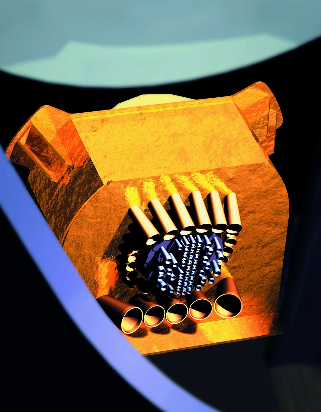 Image shows the focal plane assembly (in orange), which contains several funnel-like horns that collect incoming light. At the top, a mirror is partially visible (in grey) and, at the bottom, part of the shield (in blue).