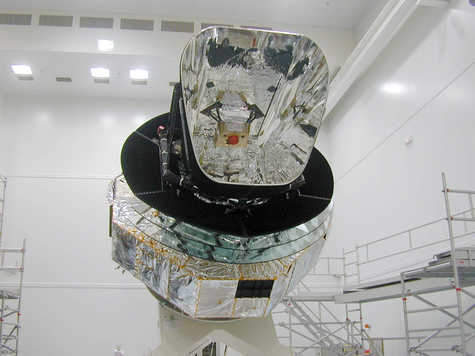 Planck QM showing the payload module with its 3 circular radiators, the huge baffle and the focal plane assembly in the centre. The two large reflectors forming the Planck telescope are still missing, when mounted the focal plane assembly will be hidden from direct view.