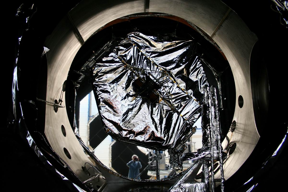 View of the Planck Flight Model #1 inside the FOCAL-5 test chamber, during preparations for the thermal test campaign.