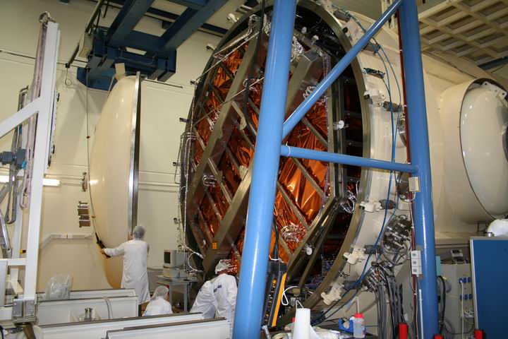 Closure of the FOCAL-5 thermal vacuum chamber at CSL. The gold coloured areas are thermal insulation protecting the thermal shrouds of the thermal tent (shrouds where nitrogen and helium are circulated for simulating the cold environment).
