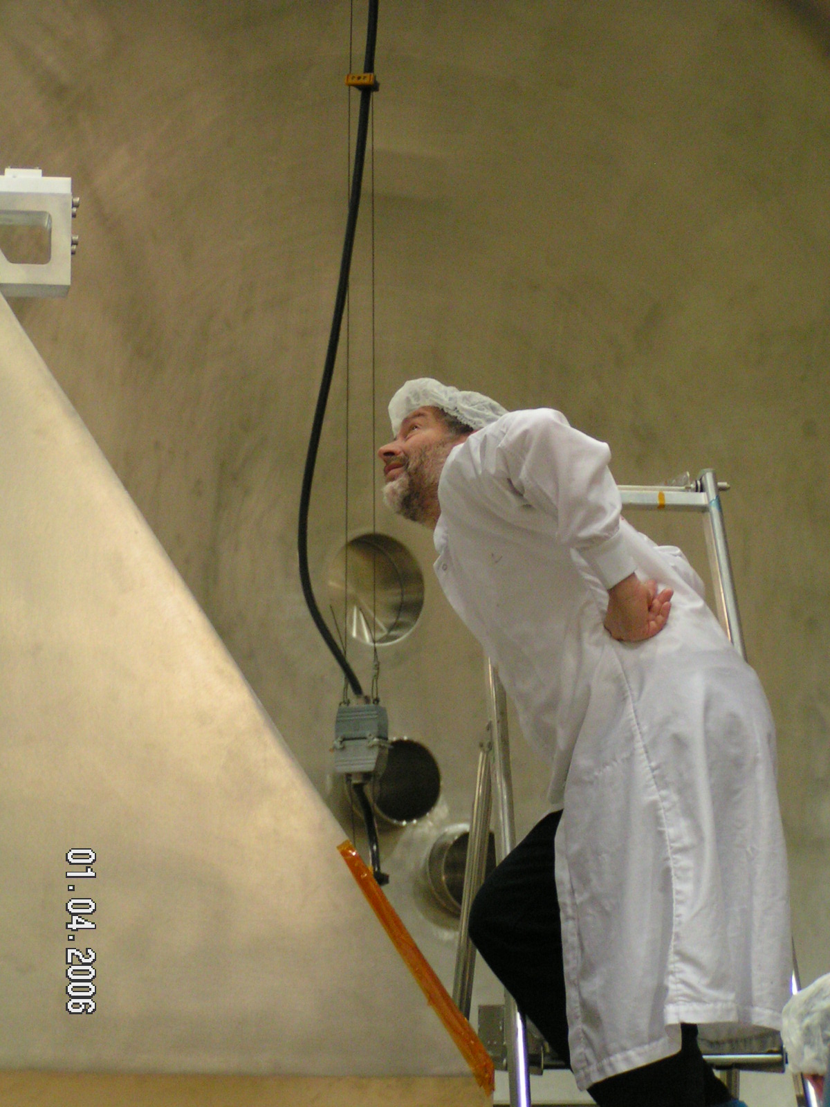 Date: 01 March 2006 Satellite: Planck Depicts: Claudio Damasio inspecting Location: Centre Spatial de Liège, Belgium Copyright: Alcatel Alenia Space Show in archive: true