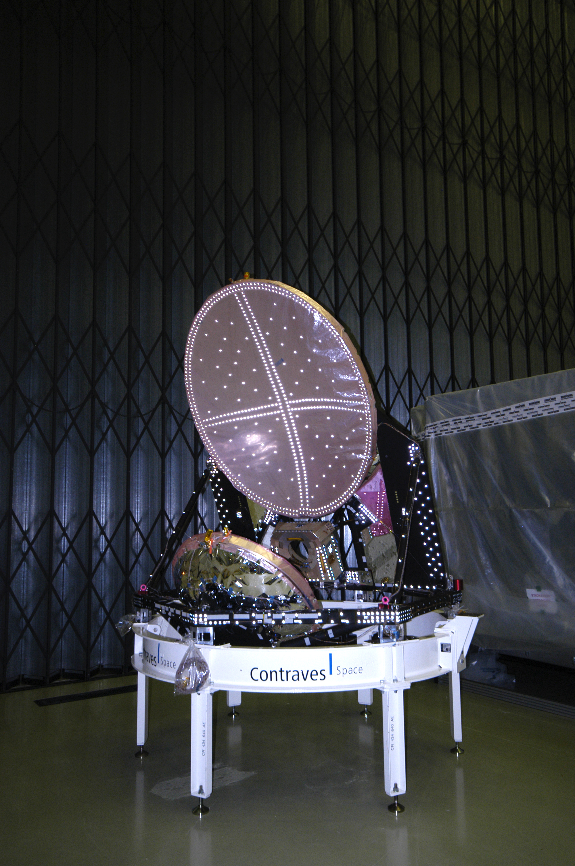 The Planck Flight Model Telescope equipped with videogrammetry targets and protective covers, on its support stand.
