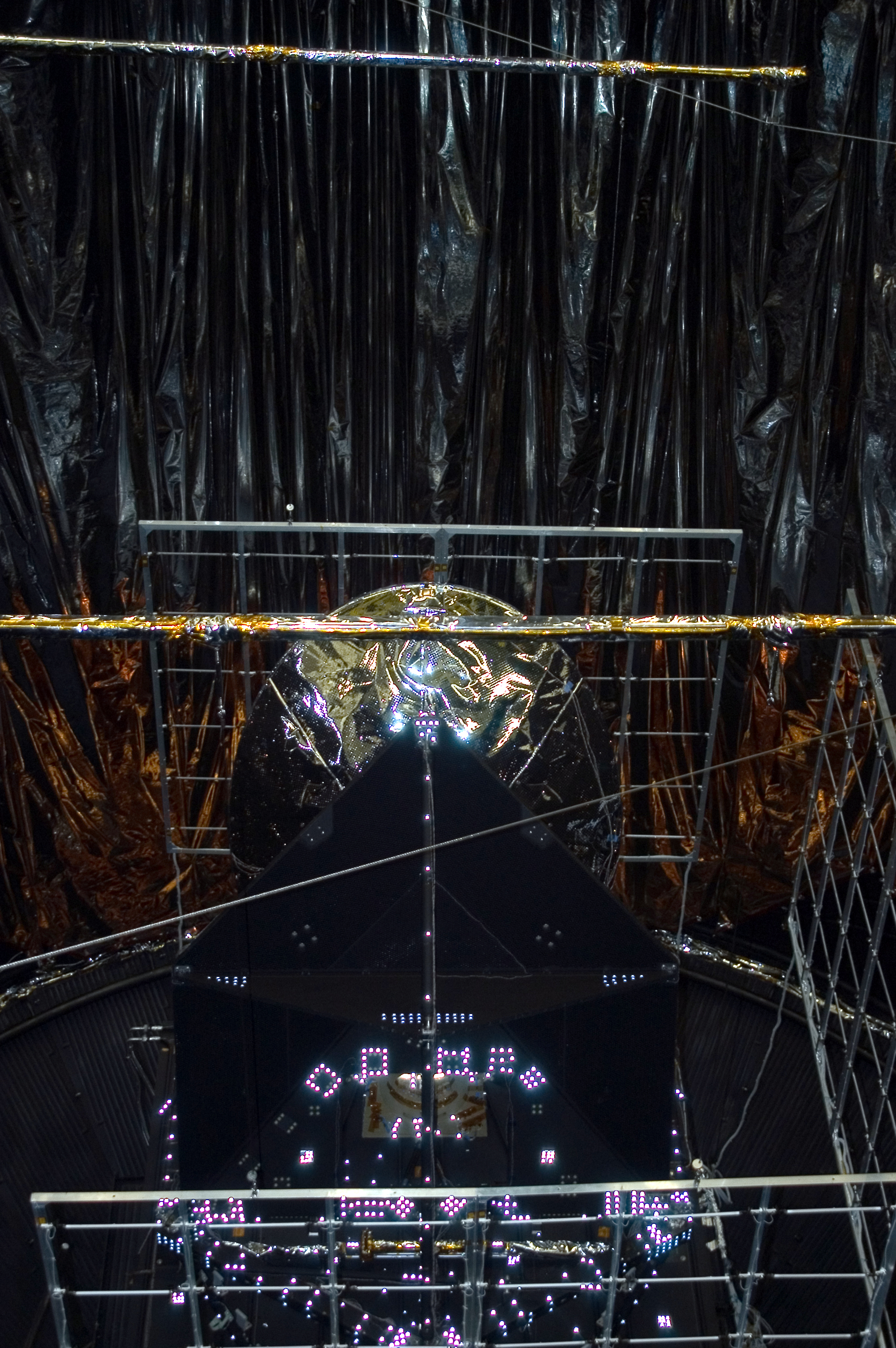 The Planck telescope ready for the videogrammetry testing inside the Large Space Simulator (LSS), seen from behind. One can see the videogrammetry targets shining and the Primary mirror Multi Layer Insulation (MLI).